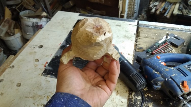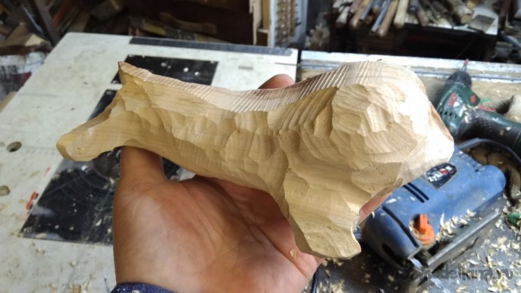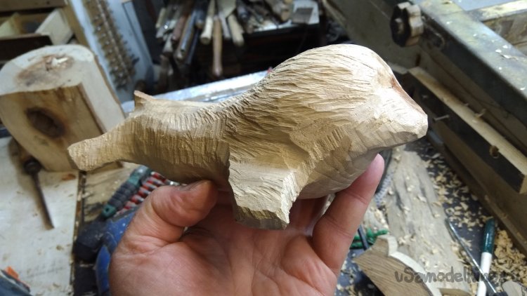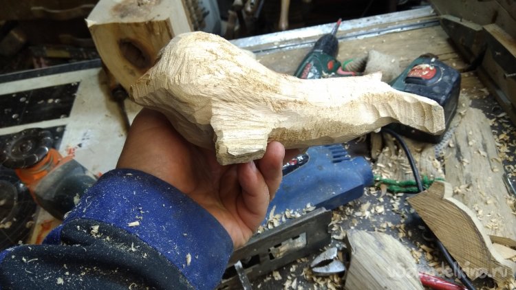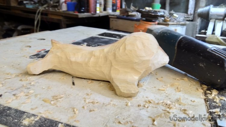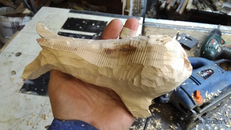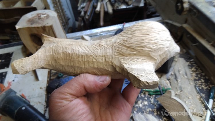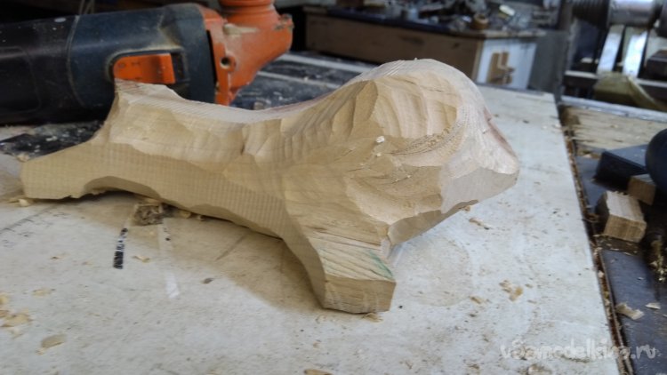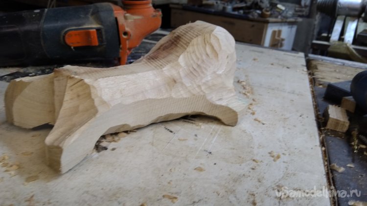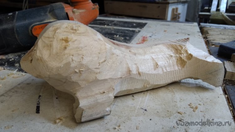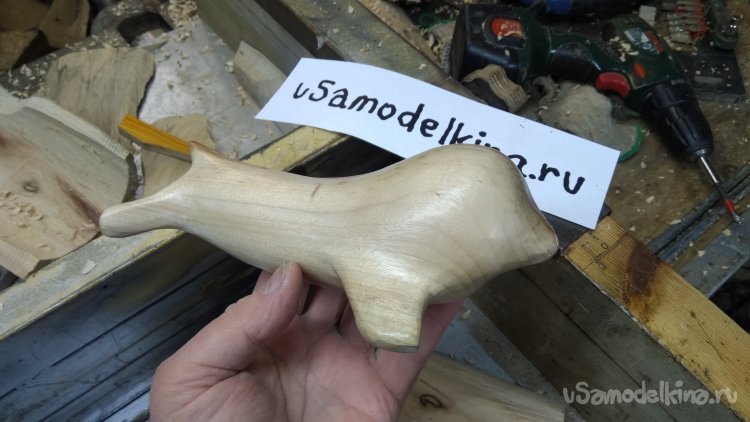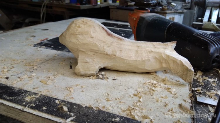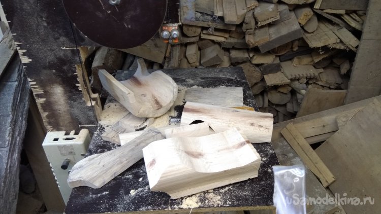 Пару месяцев назад задумал сделать белька. Это маленький тюлень ) Отпилил чурку, набросал эскиз, и забросил. То у меня пильное полотно лопнуло, то шестерня в приводе ленточной пилы свернулась, то по высоте оказывается немножко промахнулся и в самодельную ленточную пилу заготовка не встала. 210 мм всего максимальная высота пропила. Ну в общем я за эти пару месяцев уже многое что сделал, хоть и погода мешала, огородом был занят, и прочими хозяйственными делами. Но вот вчера после комментария в интернете, вспомнил что у меня недоделка валяется. Выпилил из чурбачка заготовку, предварительно доработав ленточную пилу. Пилил белька в трёх проекциях, на видео только две проекции заснял, неудобно одному и пилить, и снимать и держать в голове что я хочу получить в результате. На видео если посмотреть что я выпилил, так с трудом можно догадаться вообще что это ))