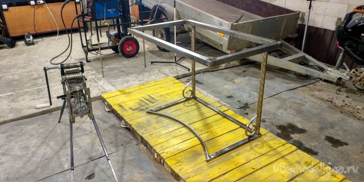 Далее я сделал нижнюю рамку. Но я не хотел квадратную, я хотел загнутую внутрь одну грань. Поэтому взял трубогиб и на нем прокатал до нужно мне радиуса. Сама рамка из профиля 20х40, а радиусная часть – прокатная труба 20х20.