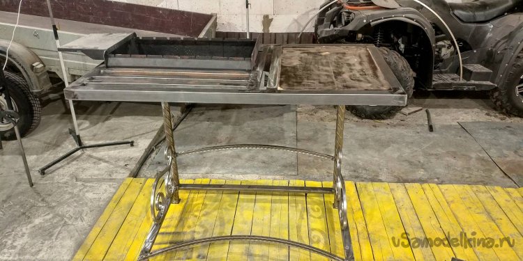 Следующим шагом я начал приваривать к столешнице профиль 20х40 таким образом, чтобы слева у меня было место под мангал, а справа столик. Причем, до столика я сделал промежуток, чтобы жар не расплавил лак.