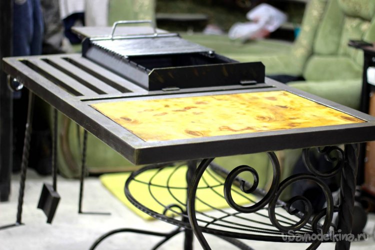 Также на этой фотке справа видно, что деревянная вставка немного обуглилась, т.к. я преимущественно использую дровишки, а они дают жар побольше, чем уголь. Если будете делать, то есть смысл расстояние между мангалом и столешницей сделать побольше.