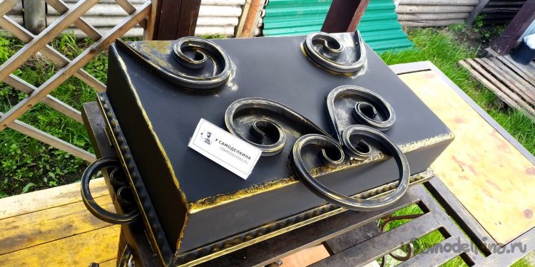 Крышка. Вот ее не хватало! Я не имел опыта с таким мангалом или барбекюшнецей. Сварганил по объему точно такую же, как сам мангал. Размеры крышки 61х40х14см. Выполнил из листа 1,5мм. Чтобы его не повело, по контуру внутри приварил профильную трубу 15х15. Потом к ней по бокам приварил полосы. Чтобы не было щелей, обварил снаружи сплошным швом.