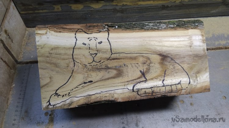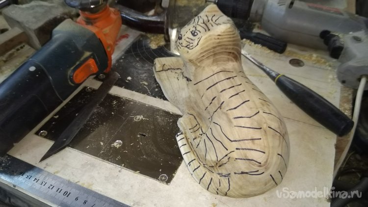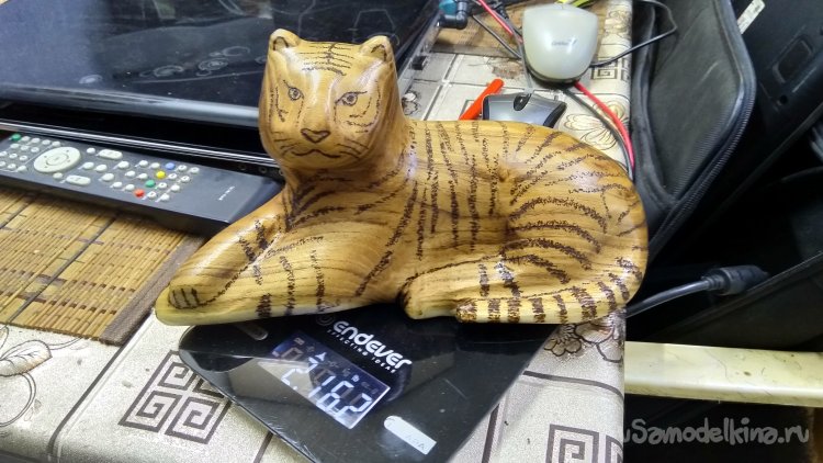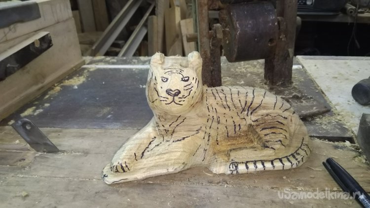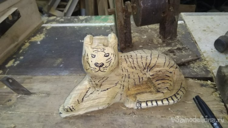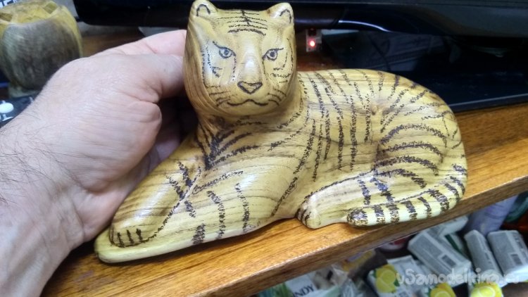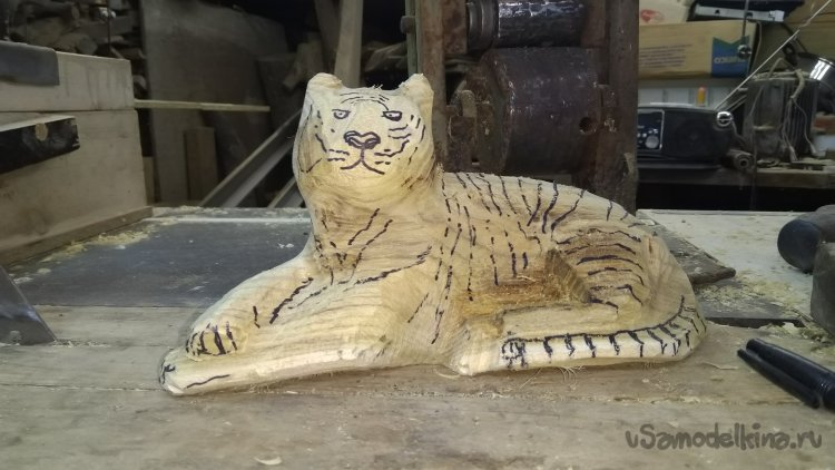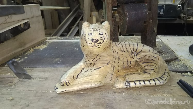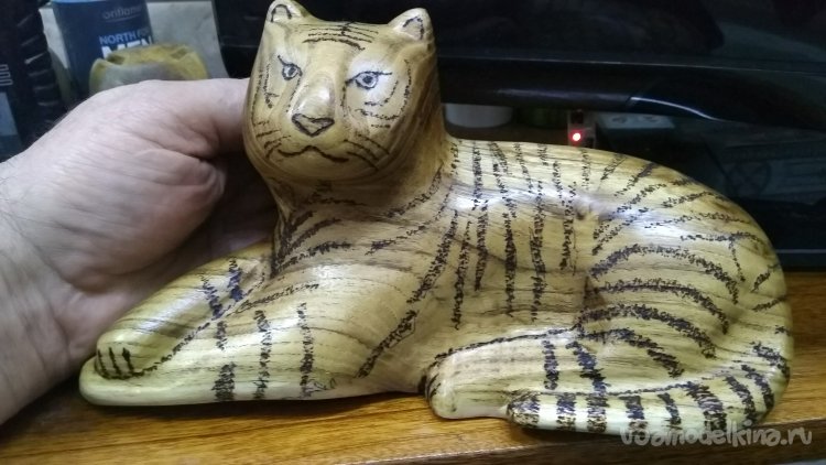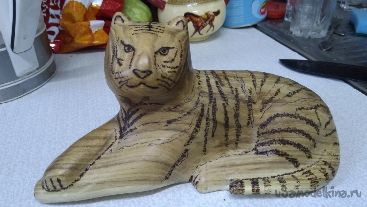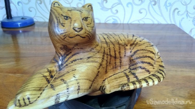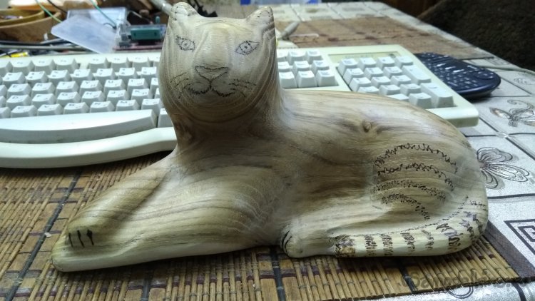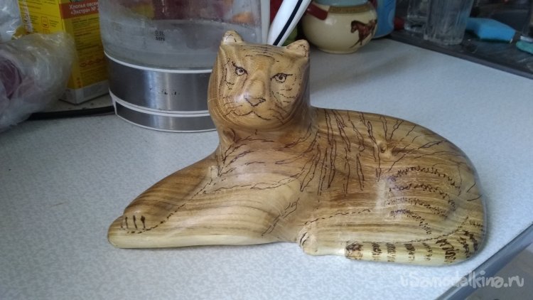 В окончание работ подрисовал фломастером глазки, ушки, усы и полоски, после того как понял что улучшить далее не в моих способностях, электровыжигателем закрепил рисунок и покрыл фигурку смесью масла льняного с пчелиным воском.