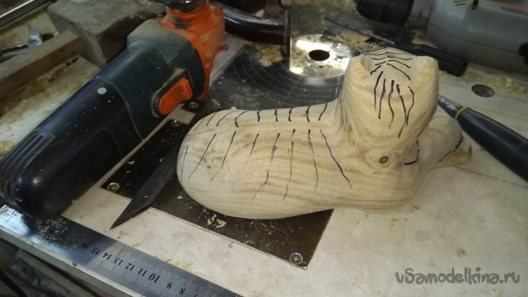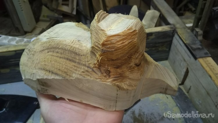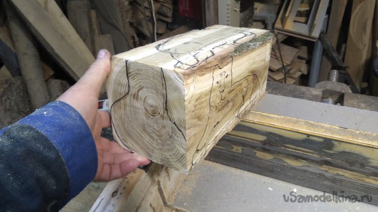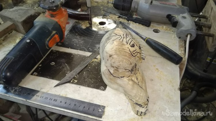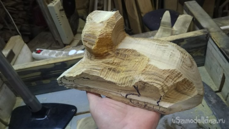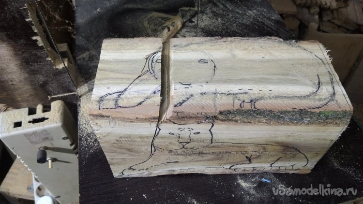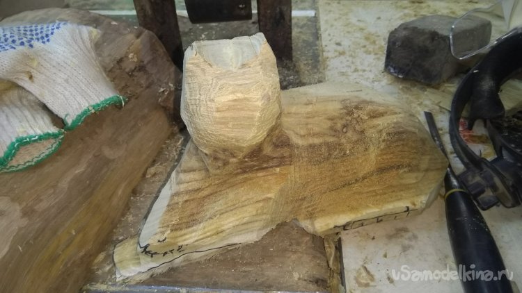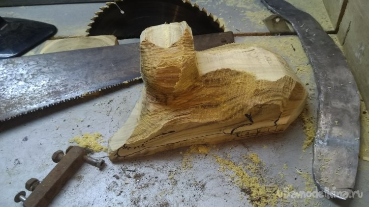 Ну вот я например, для изготовления этой фигурки сначала отпилил цепной бензопилой кусок от дерева которое повалила буря. Привёз домой, дерево очень тяжёлое, отпилил на циркулярке примерно такой кусок как надо для фигурки, окорил его, опилил на квадрат. Набросал эскиз фигурки в трёх проекциях и пропилил по контуру на самодельной ленточной пиле. Далее строгальной насадкой к болгарке острогал грубо болванку, рашпилевой насадкой к болгарке загладил следы от строгальной, заодно контролируя форму фигурки.