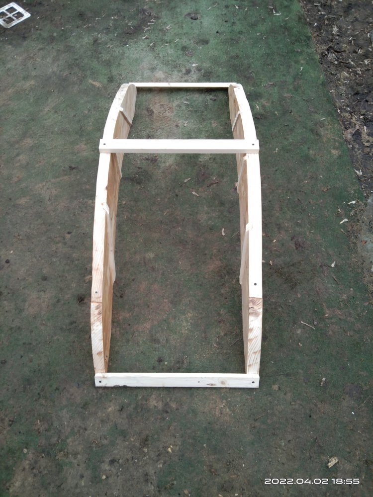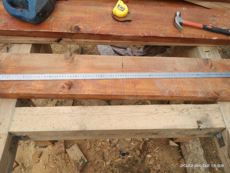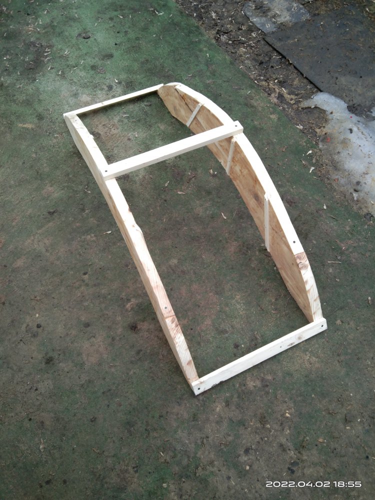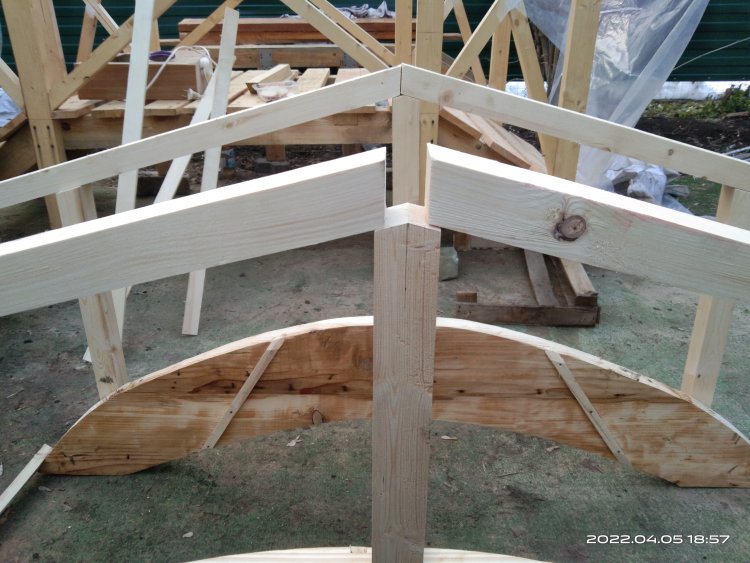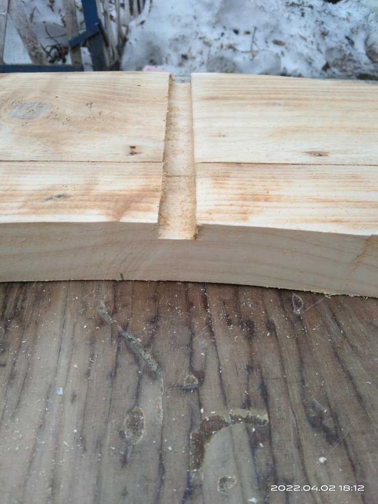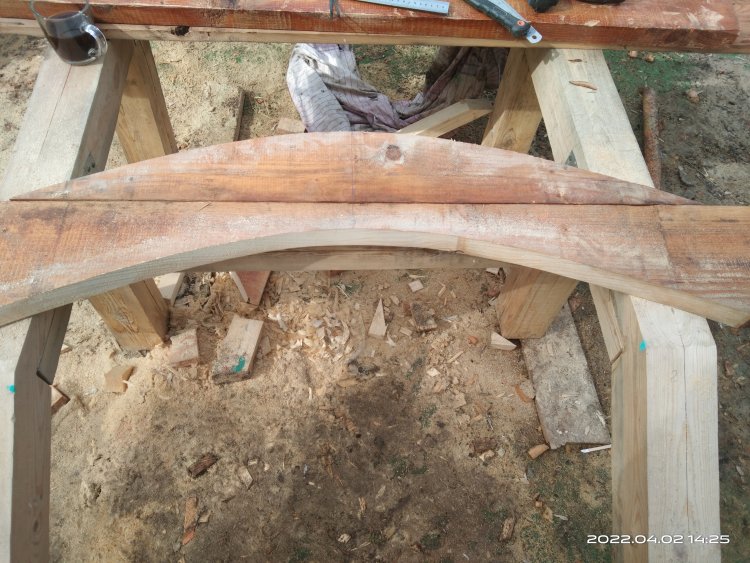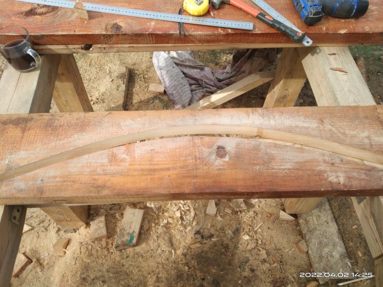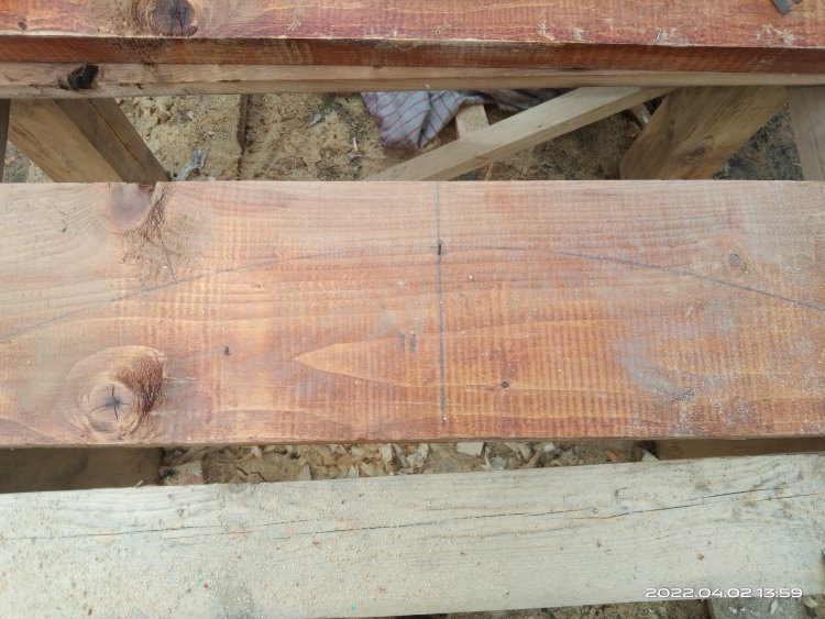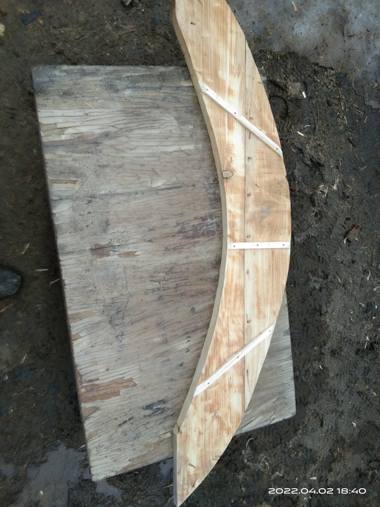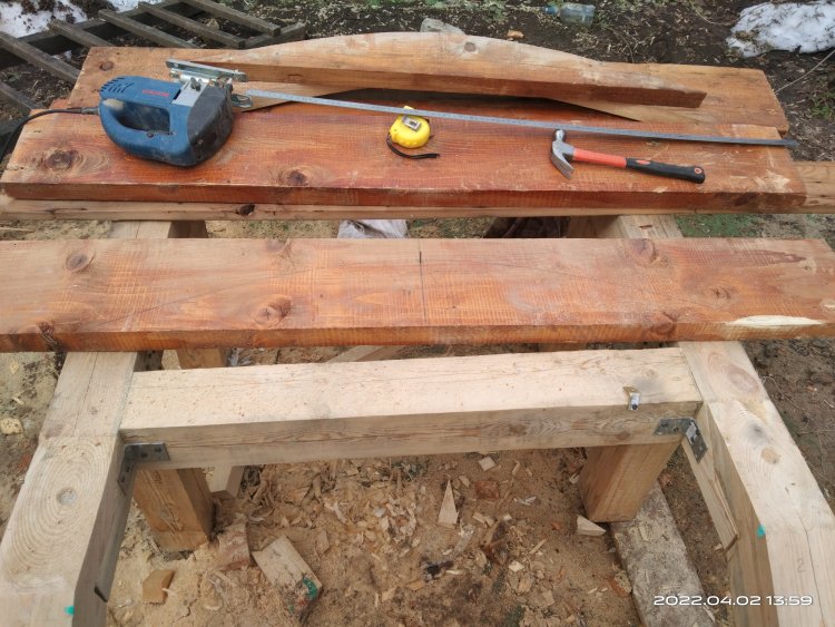 Далее в размеченный центр вбил гвоздь. От краев доски сделал отступ, по которому буду размечать ножки моста. Металлической линейкой делаю изгиб, т.е. совмещаю ею отмеченные отступы по краям доски и через центральную часть, там где гвоздь, обвожу по линейке полукруг. Использую лобзик по разметке выпиливаю эту часть доски. Выпиленную часть ставлю наверх. По заранее размеченному центру на доске, совмещаю две получившиеся половины. По краям скрепляю саморезами. Одна часть мостика готова. Аналогично делаю вторую.