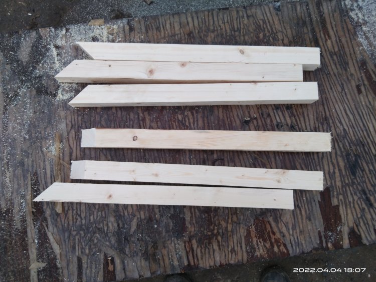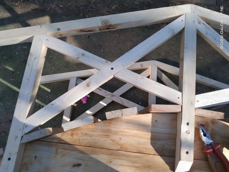 В принципе мост можно было оставить уже таким, какой он получился. Но мне не понравился его внешний вид сбоку. Как-то пустовато смотрится. Поэтому между стойками перил решил сделать перекрещивающиеся укосины. Распустил брус 40*40 мм. на две части и из них сделал заготовки. Чтобы они были ровно на одном уровне, разметил и выпилил пазы, в которые детали входят друг в друга. К стойкам укосины крепил гвоздями, а центральный перекресток двух деталей стягивал саморезом. Вот что получилось в итоге. Весь мостик обжег.