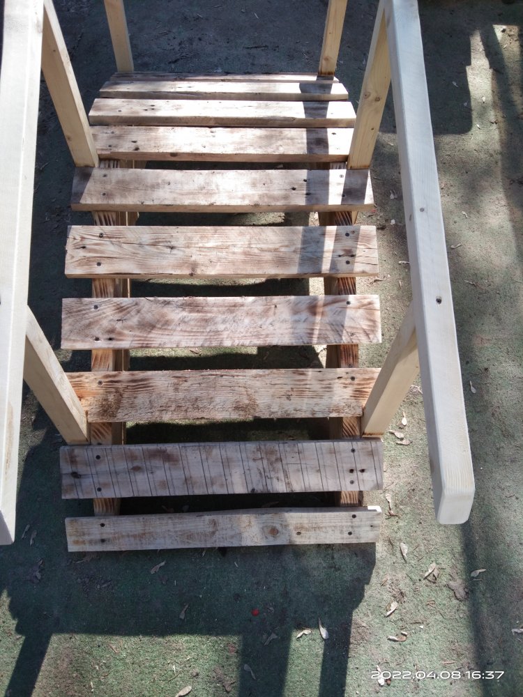 Болгаркой с лепестковым диском очищаю заготовки от старого лака. Чтобы придать конструкции большую прочность, ручным фрезерным станком делаю по три паза с внутренних сторон по 1,5 см. В них наношу клей и вставляю в пазы скрепляющие планки. Их для прочности еще и скрепляю гвоздями. Планки оставляю как есть, т.е. не делаю их вровень со стенками мостика. Брусьями соединяю обе стороны моста между собой. Затем использую брус 40*40 мм. для изготовления стоек для перил. Их нижнюю часть спиливаю под углом в 45°. Саморезами закрепляю их на сторонах моста. Использую брус такого-же размера для изготовления перил. Устанавливаю мост на бок и отмечаю угол наклона, чтобы установить перила. На торцовке убираю ненужное. Так же с помощью саморезов креплю перила к стойкам. После этого делаю настил из досок, которые сразу же обжигаю.