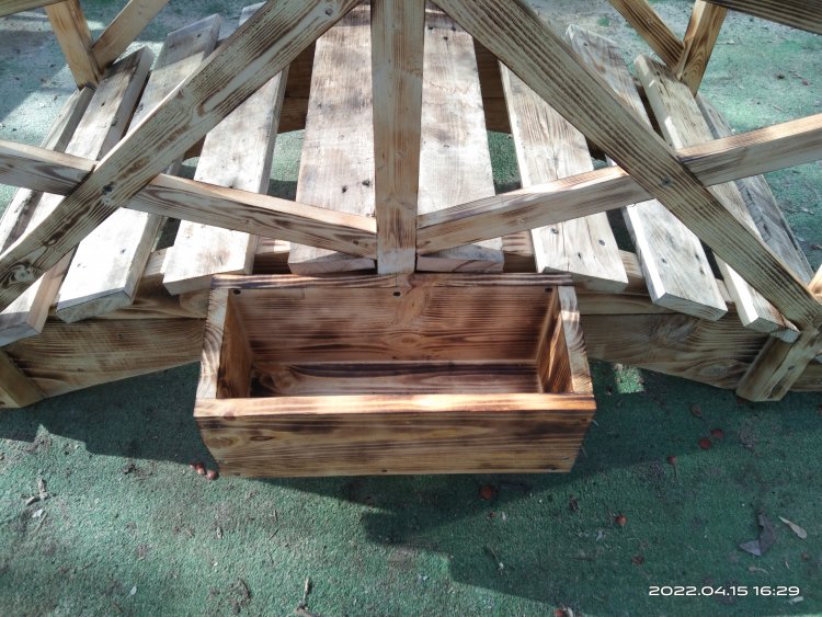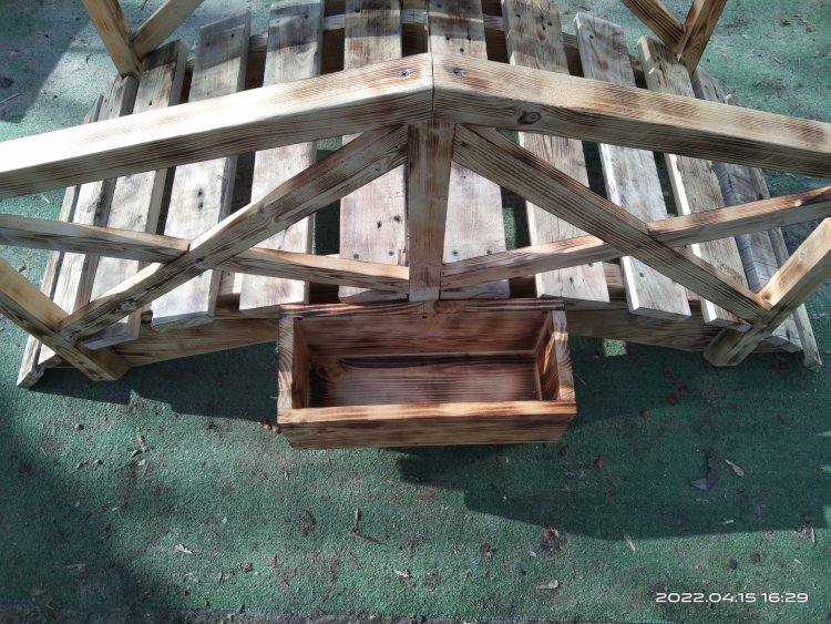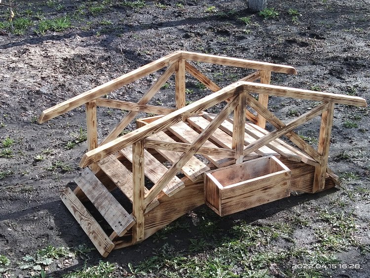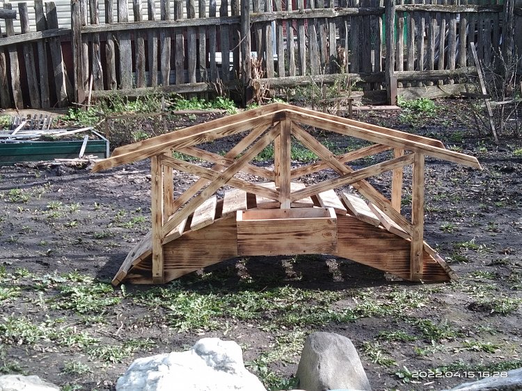 И в финале всей работы решил поэкспериментировать и сделал навесные ящики для посадки цветов на каждую из сторон моста. Ящики делал под размер емкости, которая будет вставляться в них. Если возникнет необходимость ящики можно с легкостью снять, открутив по три самореза с каждой стороны. И вот конечный результат моей работы. Думаю кому-то понравится и он возьмет эту идею на вооружение. Тем более что конструкция достаточно простая и не требует особых усилий при изготовлении.
