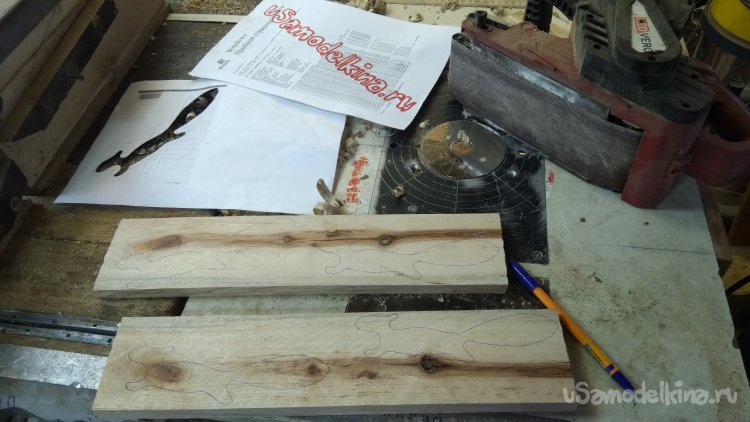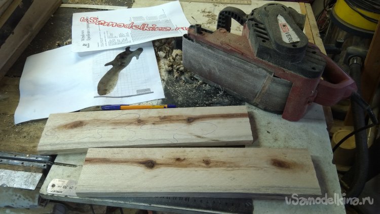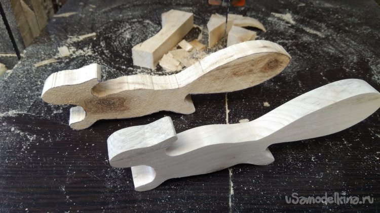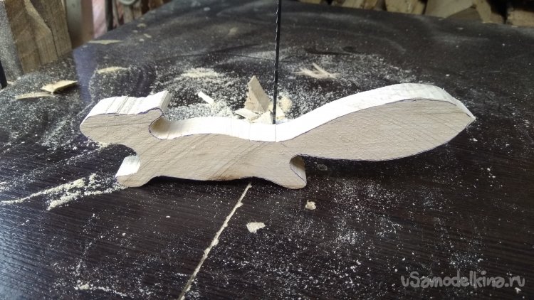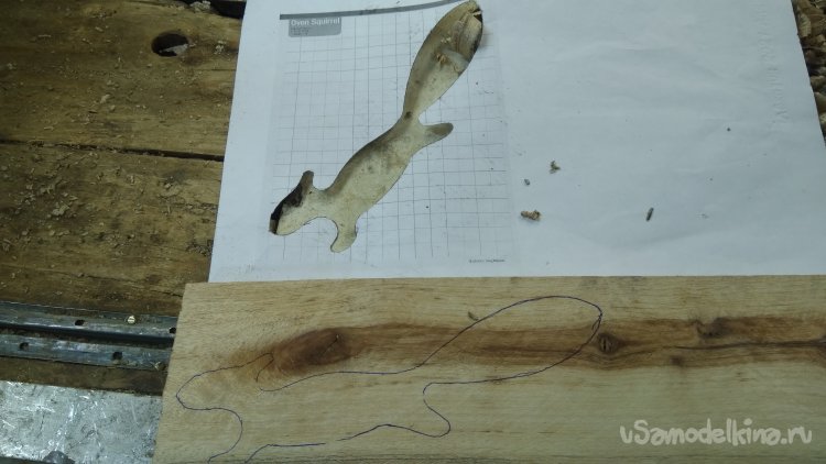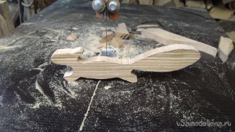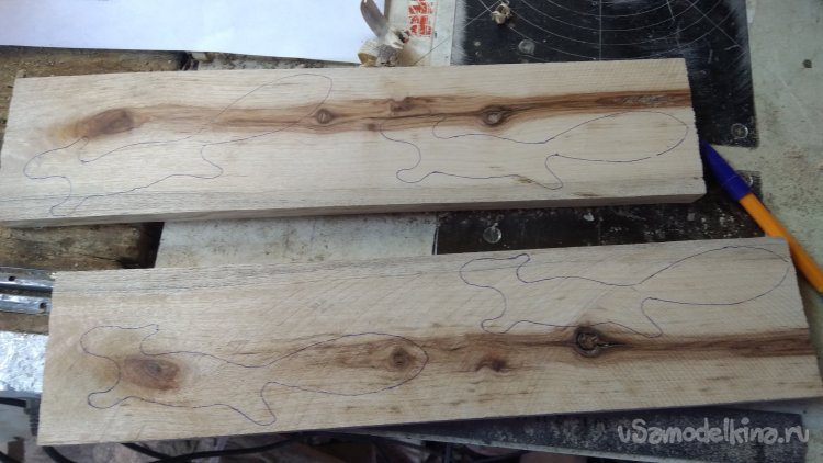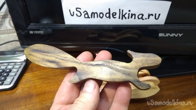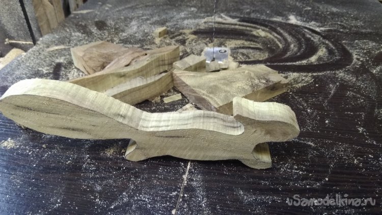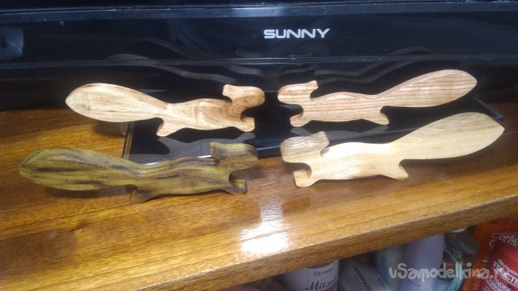 Разметка по шаблону. В интернете нашёл рисунок сохранил себе, потом оригинал потерялся, остался только листок бумаги от предыдущего рукоделия, вот с этого листка и переводил на плашки. На ленточной пиле выпилил. Хотя, конечно, можно и лобзиком пилить, и не из камфорного лавра, а из любой деревяшки. Ну в общем вот. Четыре штучки сделал, пару из камфорного лавра, одного бельчонка из эвкалипта, и ещё одного из шелковицы.