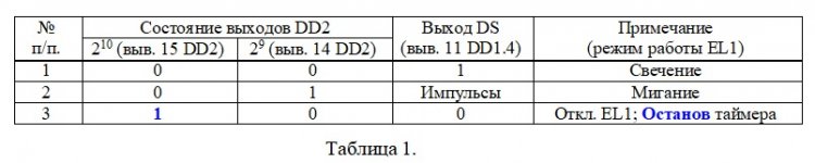 Время работы каждого рабочего цикла таймера составляет 4 минуты 40 секунд (4.40 х 2 = 9.20) и зависит от «веса» выходов счётчика DD2, к которым подключён дешифратор.