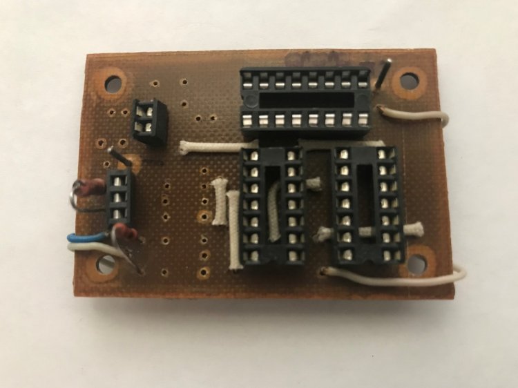 Перед пайкой радиодеталей, в печатную плату следует впаять шесть монтажных перемычек из медного одножильного провода в термостойкой изоляции. Пайку радиоэлектронных компонентов следует вести заземлённым жалом паяльника. Обойтись без заземления можно, применив для ИМС специальные розетки (панельки), и установив в них микросхемы по окончании пайки остальных деталей. Полевые транзисторы VT1 - VT3 также желательно установить на плату при помощи самодельных трёхвыводных розеток. Такие розетки изготавливаются из большой розетки для микросхем Dip14 с шагом между выводами 2,5 мм. при помощи пинцета и монтажных кусачек. Четвёртый с края вывод – гнёздный контакт выталкивается из розетки со стороны пайки пинцетом, и трёхвыводная часть розетки с двух сторон выкусывается монтажными кусачками. Таким способом из 14-выводной розетки для ИМС можно сделать 4 маленькие.