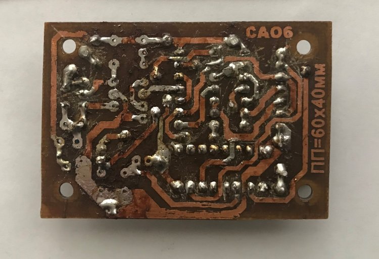 Печатная плата САО6 выполнена из односторонне фольгированного стеклотекстолита размерами 60 х 40 мм. толщиной 1,5…2,5 мм (см. рисунки 2 и 3).