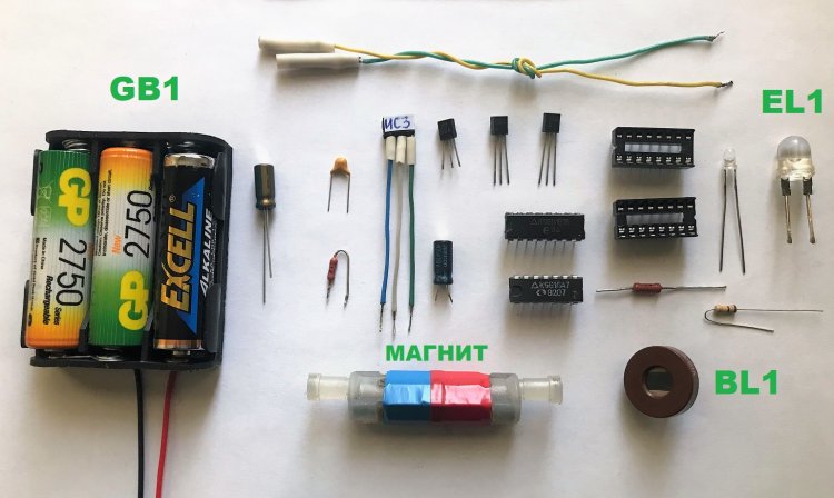 Почти все детали для изделия изображены на фото – рисунке 9. Сокеты DIP3 можно удлинить разноцветными проводами, если до ПП схема будет проверяться на макетке. Хотя, схема автором дважды проверена и в ПП ошибок нет. Трудности могут возникнуть только при поиске HL1 с частотой генерации 1 Гц.