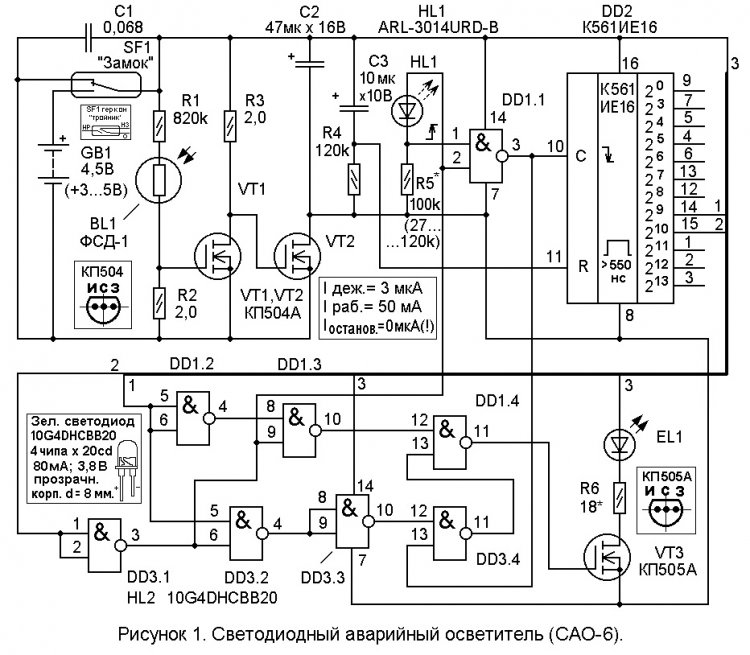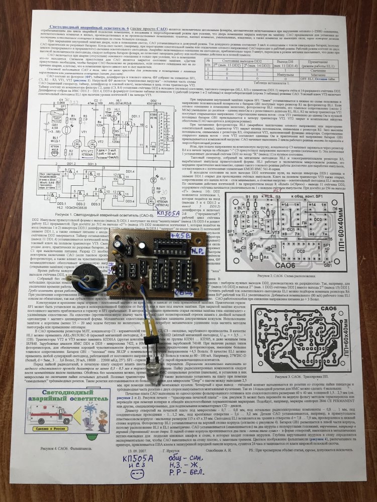 В САО6 применены резисторы МЛТ, конденсатор С1 - керамический типа КМ4. С2, С3 – оксидные, зарубежного производства. В качестве HL1 можно применить ARL-5013URC-B (красный мигающий светодиод; d = 5 мм), L-56BHD (жёлтый мигающий светодиод; U пр. = + 3,5 … + 12В). Транзисторы VT2 и VT3 можно заменить КП501А (другая цоколёвка) или любым из группы КП501 … КП505 (кроме КП503). А VT3 - даже мощным типа IRF840. Зарубежные аналоги ИМС DD1 и DD3 - микросхема 7422, а ИМС DD2 заменима зарубежной 74168. При наличии разных типов фоторезисторов, для обеспечения хорошей чувствительности фотореле, следует отдать предпочтение фоторезисторам, имеющим большее темновое сопротивление. Батарея GB1 составлена из 3 элементов типоразмера AA-size с номинальным рабочим напряжением +1,2 … 1,5 Вольта. В качестве EL1 можно применить любой суперъяркий светодиод, работающий от постоянного напряжения 3 … 4,5 Вольта и током до 80 ... 100 мА. Например, 27W20C-D (белый, d = 5мм., 3 … 3,6 Вольт, 20 мА, 18000 … 22000 мКд, 25°). SF1 - геркон «тройник» с парой переключающихся контактов.