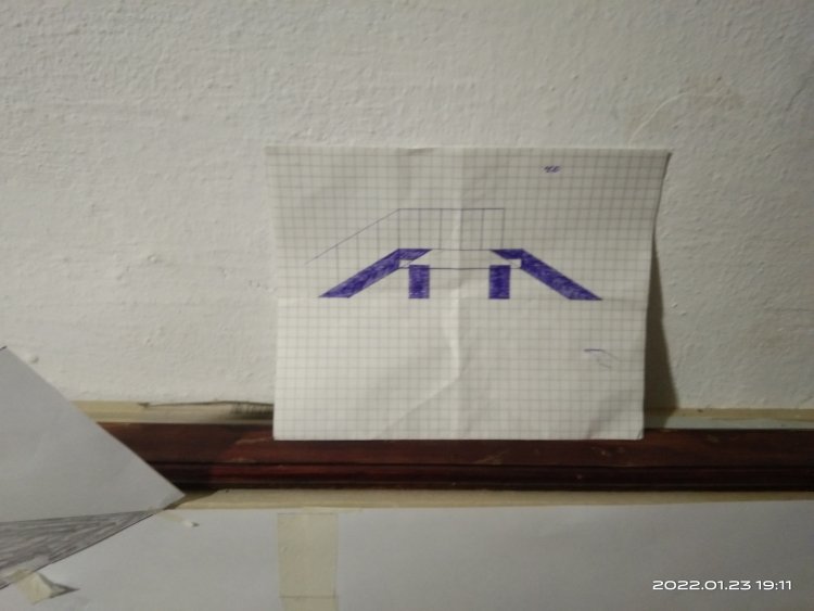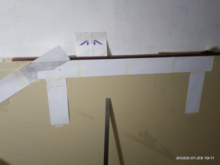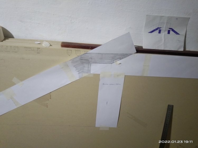 Для начала мною была нарисована полноразмерная модель для изготовления шаблонов. Для этого я использовал лист гипсокартона, который как раз имеет длину 2,5 метра. Прикрепил к гипсу бумажные заготовки и на них уже прорисовал все необходимые мне узлы. А именно стыковочные. Вот такими должны были быть места соединения основной к наклонным частям моста.