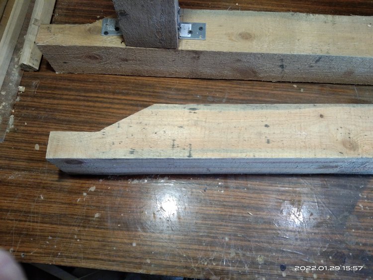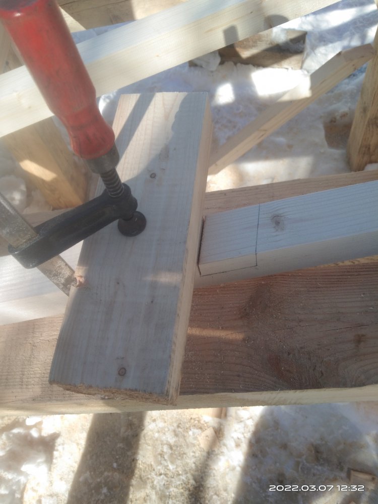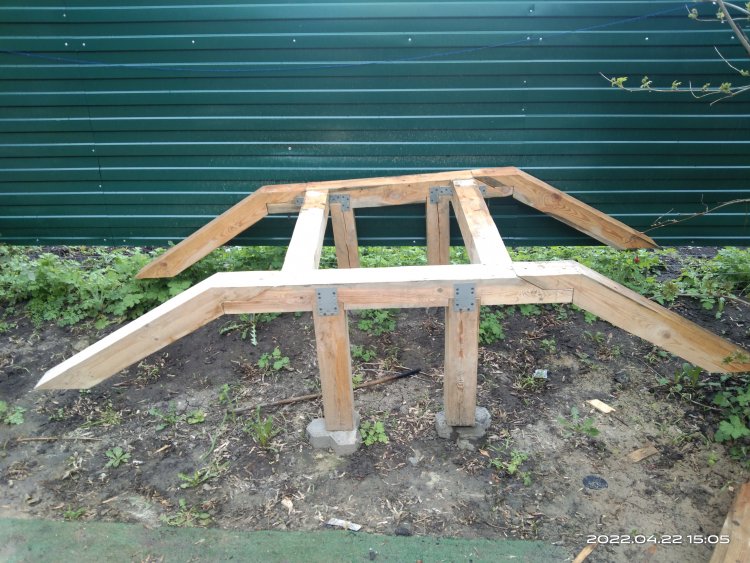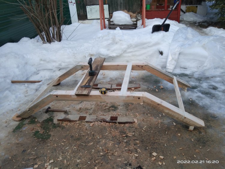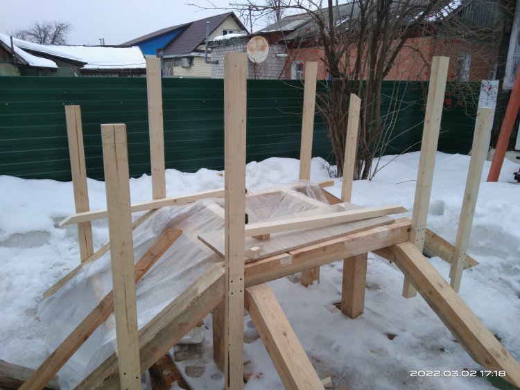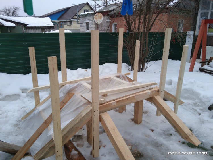 Сфотографировал полученный результат и отослал заказчице. Вот с этого момента и начинается все самое интересное! Так как делалось все практически под неусыпным контролем заказчицы, т.е. практически каждый этап был сфотографирован и отсылался, никакого подвоха я не ожидал! Ответ я ждал несколько дней, но не особо и волновался, времени еще много, по договору я должен был отдать готовые изделия в середине марта, да и мало ли какая ситуация может быть у человека. И вот наконец мне пришел ответ. Якобы она не так представляла себе этот мост. И это при том, что она полностью видела что получается! Но самое интересное это то, что человек на досуге, или как ей пришла в голову эта мысль, решил увеличить размер водоема над которым должен стоять этот мост! И, соответственно, такое расположение ножек ей не подходит!! После продолжительных препираний решили сделать всю основу заново, т.к. предложенные варианты заделать углубления под ножкам ее не устраивали! Пришлось заново покупать брус, благо все расходы оплачивала заказчица и делать все заново!