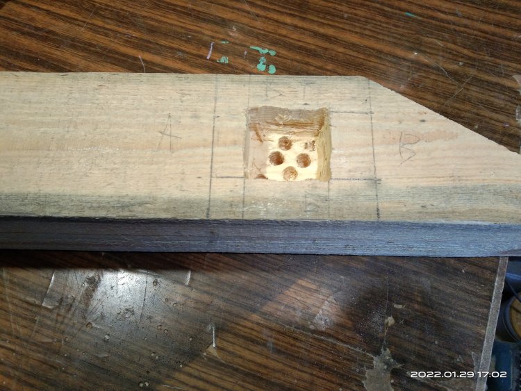 В верхней части отверстие под шпилькой расширено, чтобы в нее свободно входила шайба и гайка, т.е. чтобы их не выло видно снаружи и в дальнейшем они не мешали монтировать настил. Вот такая заготовка получилась после всех вышеописанных действий.