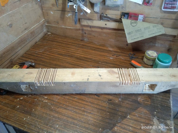 А вот уже вторая версия готовой основы моста. Поперечные ребра жесткости делал из бруса 70*50 мм, для которого сделал пазы и закрутил саморезами.