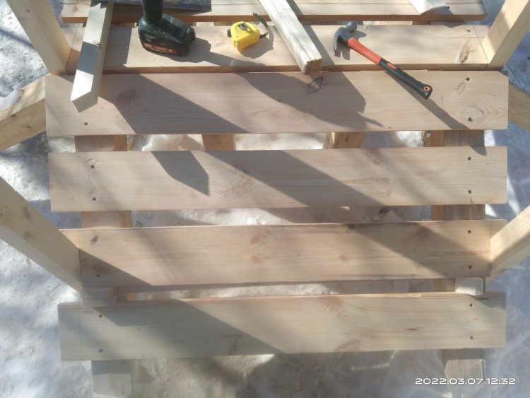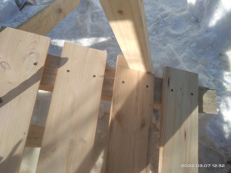 Далее нужно установить боковые перекрещивающиеся перекладины между стойками перил. Для этого я использовал брус 40*40мм. Напилил нужные мне по размерам заготовки и в каждой из них сделал паз глубиной в половину толщины самой заготовки, чтобы вставляясь друг в друга детали были на одном уровне, без выступов. Перекрещивающиеся соединения деталей зафиксировал саморезами. Но перед этим настелил пол, чтобы боковины были над ним, а не выступали ниже него. Доску для пола в основном использовал 25*140 мм. Все соединения жестко зафиксировал саморезами. Далее пришлось поработать болгаркой, чтобы сгладить ребра брусков. Пробовал фрезерным станком, но т.к. дерево сосна, в некоторых местах, особенно против волокон, они задирались и их приходилось убирать уже вручную. Поэтому все загладил сначала УШМ, а потом шлифовальной машинкой. В тех местах где с помощью инструмента было неудобно подлезть, шлифовал наждачной бумагой.