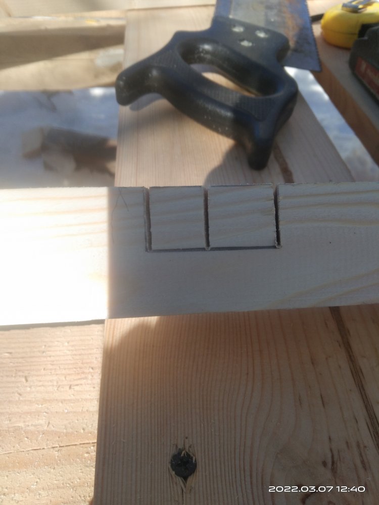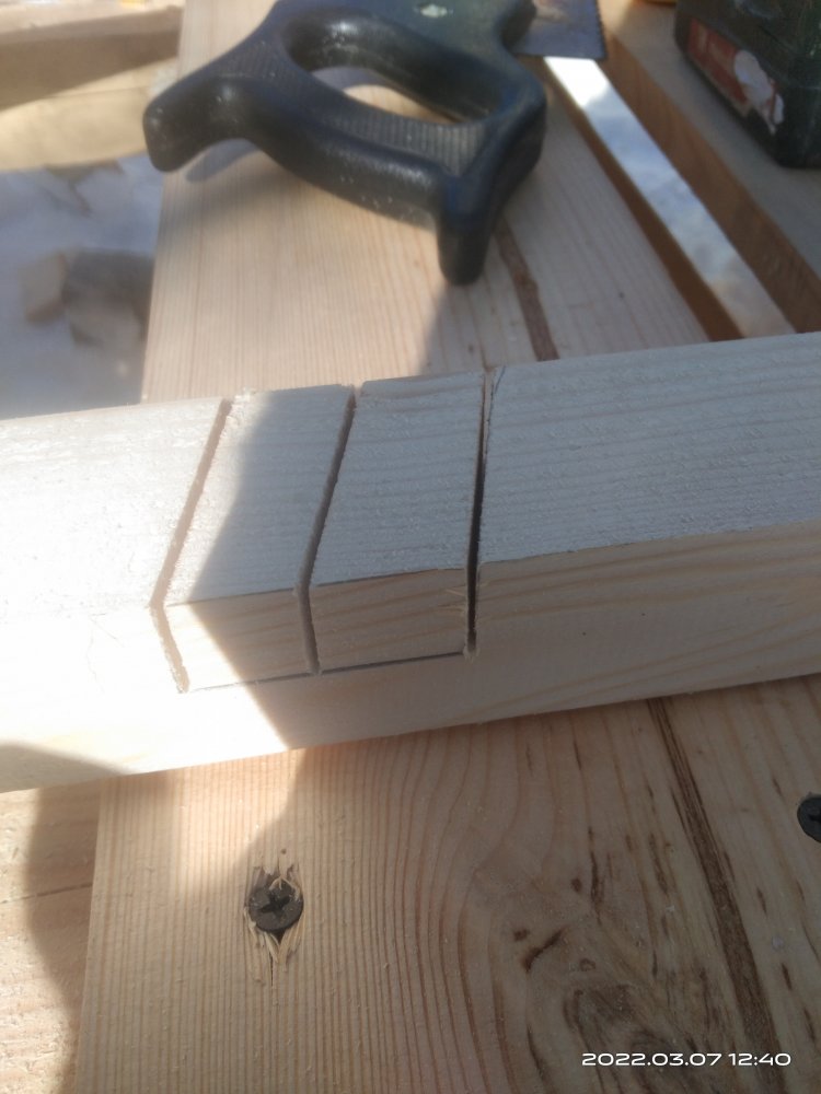 Т.к. брус имеет длину 6 метров, то для удобства работы с ним пришлось его сразу в момент покупки попросить распилить на части. Далее с помощью бумажных шаблонов перенес контуры отпиливаемых частей на заготовки. Пилить пришлось ручной пилой, чтобы узлы получились более точными. Радости мне это занятие, конечно же, не принесло. Для удобства пиления детали под углом закрепил на бруске деревянные направляющие для пилы, чтобы полотно скользя по ним не уходило в сторону. Деталей должно получиться шесть штук. И у них 2 разных угла среза. Две в средней части, и четыре наклонных. Когда все детали были изготовлены начал их собирать. В боковых частях основных деталей сделал по два углубления. В них будут вставляться поперечные брусья для придания большей жесткости и прочности изделию. Затем выпилил пазы для ножек моста.