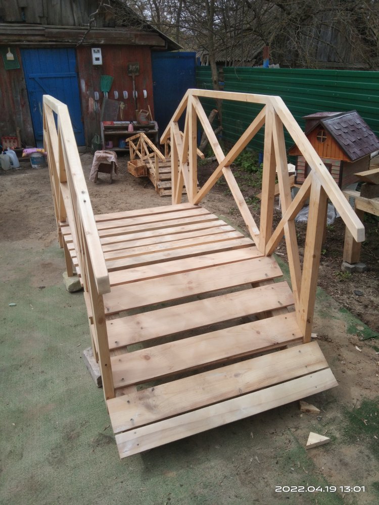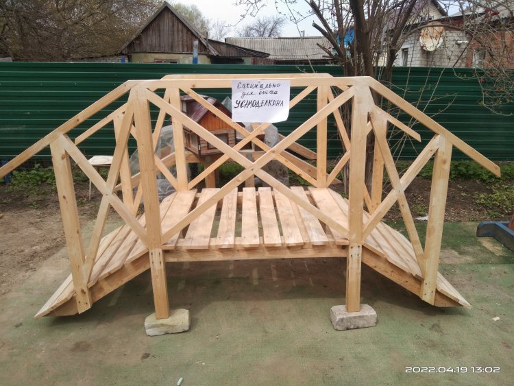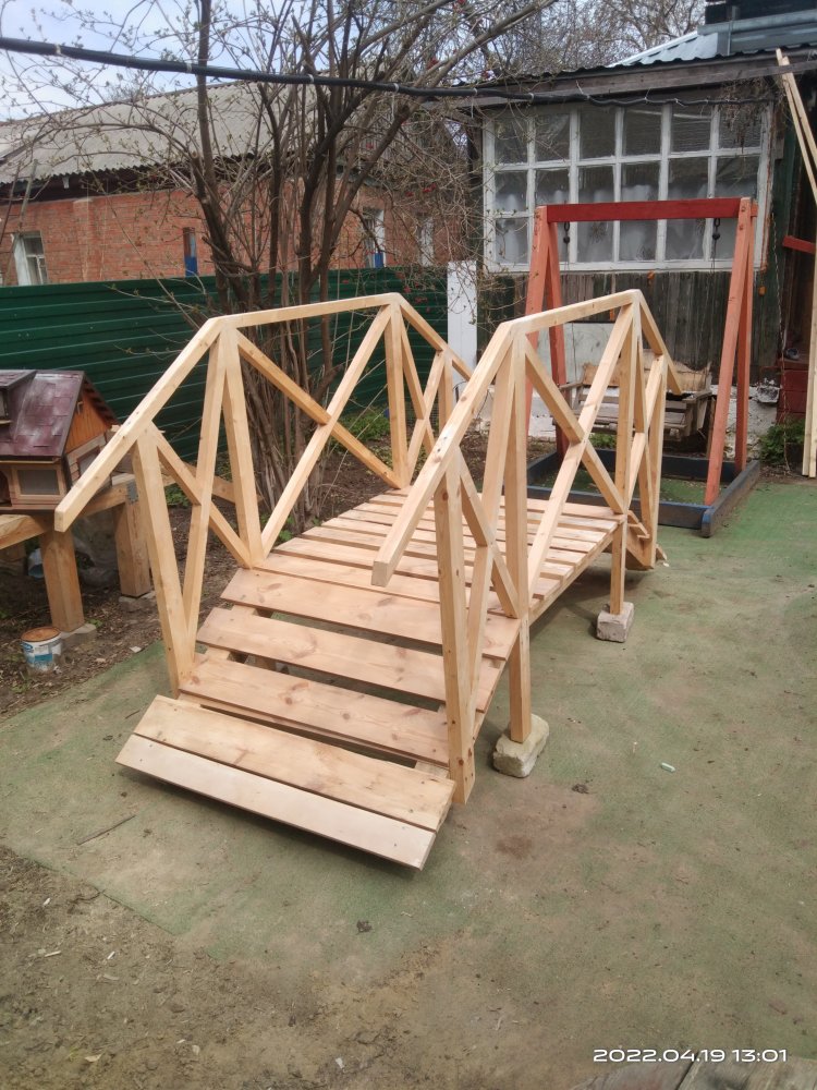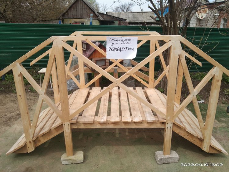 15 апреля(!) за мостом и перголой приехала заказчица. Облазила его со всех сторон, даже не побоялась залезть на него, хотя он и стоял на кирпичах не очень устойчиво. В конечном итоге осталась довольна, даже сказала что этим летом попросит сделать ей еще "беседку как пергола". Но, если честно, вряд ли я возьмусь за этот заказ. С таким непостоянством, какое продемонстрировала данная заказчица, мне мои нервы дороже! А переделывать уже готовое, или делать заново - даром такое счастье не нужно!