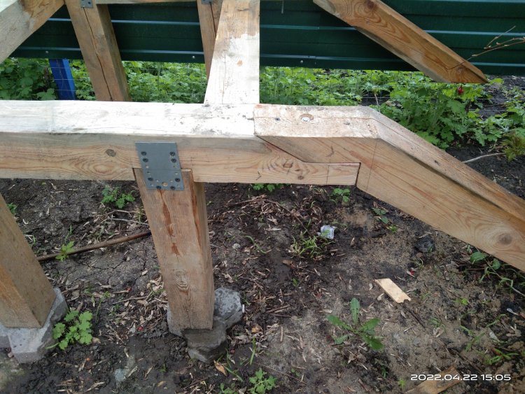 Ножки моста, так же как и в предыдущей версии, должны были быть так же сделанными из бруса 100*100мм. Но я все же решил еще раз уточнить то, как делать: как планировали, или опять что-то новое... Опять пришлось переигрывать. Ножки должны быть единым целым с перилами. Поэтому сделал их из бруса 70*50мм. Крепил их саморезами, ближе к стыковочным узлам основы. По 4 штуки с каждой стороны. Два центральных боковых выполняют функцию ножек и стоек для перил.