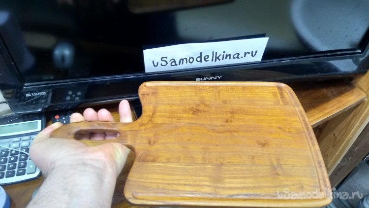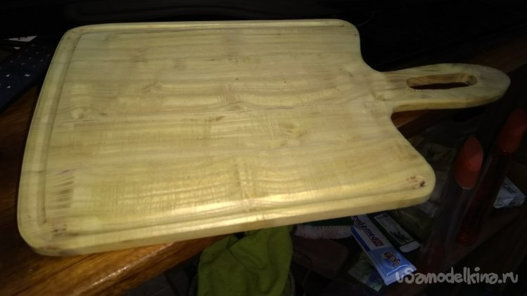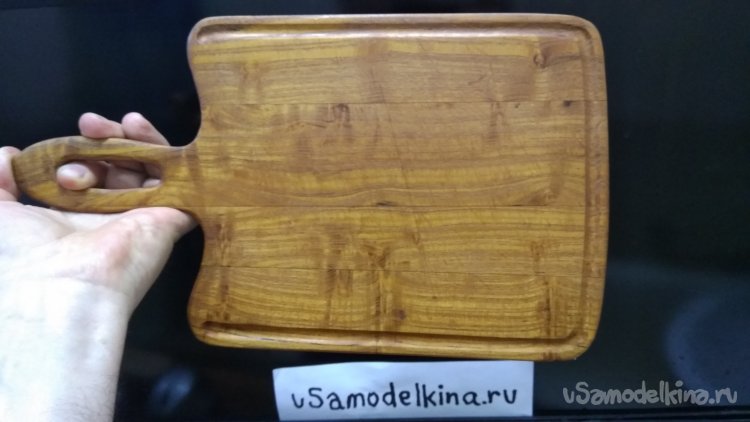 После склейки нарисовал контур, сообразуясь с удобством ручки за которую буду её брать, и за которую она будет вешаться на крючок над мойкой. Ставить мокрую на ребро, тем более плашмя категорически не рекомендуется. Любая влага хорошая среда для бактерий, ну и досочка мокрая будет портиться, а сухая долго проживёт. По контуру пилю самодельной ленточной пилой, в рукоятке отверстие выбираю лобзиком, далее фрезером, установленным в стол, делаю профиль боковых поверхностей, и сменив фрезу, делаю полукруглую ложбинку по периметру досочки. Сок задерживает, и крошки, поэтому такая выборка не для красоты, а сугубо по делу. Далее шлифую наждачной бумагой постепенно снижая зернистость, примерно 360-600 грит достаточно для чистовой шлифовки дерева. После этого мою, и оставляю высохнуть, после сушки приглаженные волокна поднимаются, зашлифовываю самой мелкой наждачкой, ещё раз мою, и после высыхания покрываю смесью льняного масла с пчелиным воском. Поверхность становится гидрофобной, вода скатывается, и легко моется. Примерно за неделю масло льняное окончательно полимеризуется, и можно несколько раз в течении недели обновлять покрытие. По истечении недели уже никаких дополнительных действий не требуется.