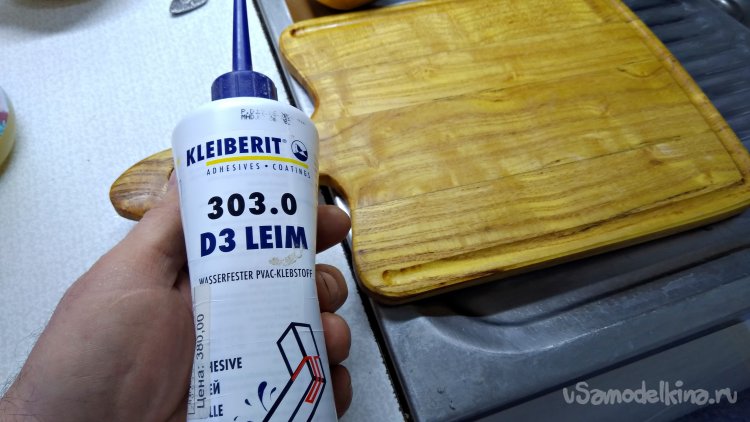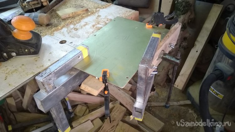 Для склейки зажал в тиски по дереву, снизу и сверху подложил пластины для исключения коробления склеиваемой досочки.