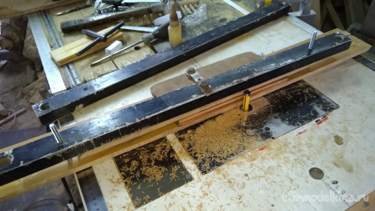 Для выравнивания боковой поверхности под склейку, использую простое приспособление, зажимаю в пакет с дюралевой направляющей, она служит базовой поверхностью для фрезеровки.
