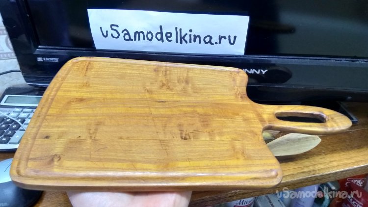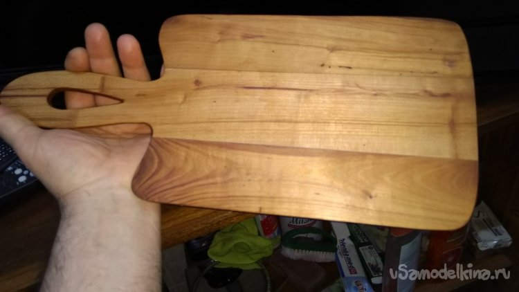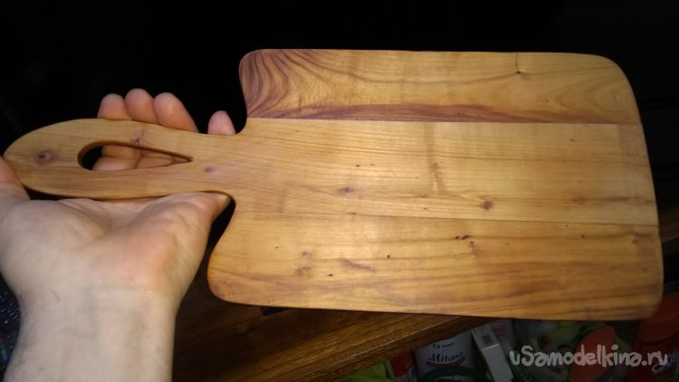 Сломал я свою заслуженную досочку из черешни, 2016 года изготовления, специально по фоткам посмотрел, когда делал. Фотки той поры не сохранились, ни самой досочки, ни изготовления её, просто я делал сразу парой, вместе с лопаточками для сковородок. И один комплект подарил своим гостям. Вот их фотки у меня остались. Оттого и знаю когда делал.