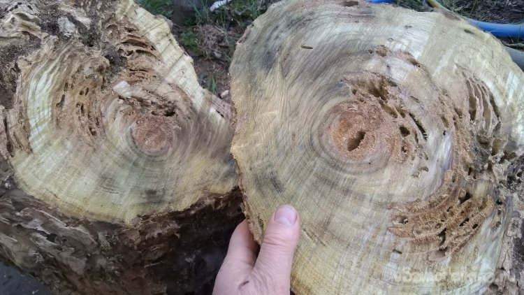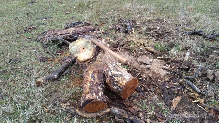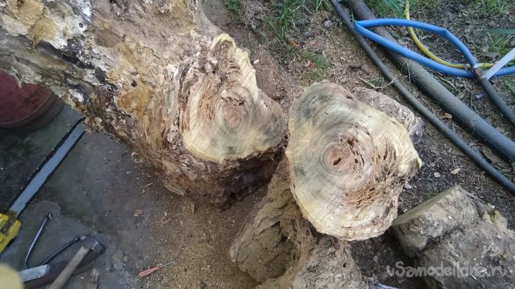 Вот такое брёвнышко валялось не один год на земле. Там и вросшая колючая проволока была, и плющом заплетено, поэтому никто не зарился на это сокровище.
