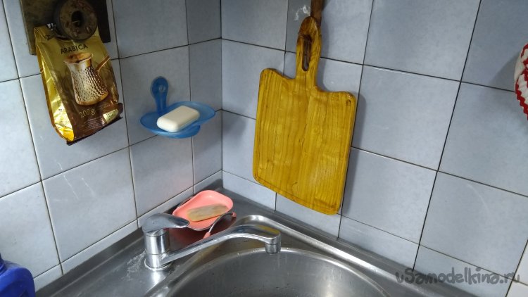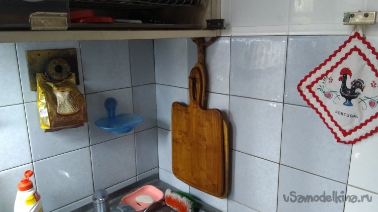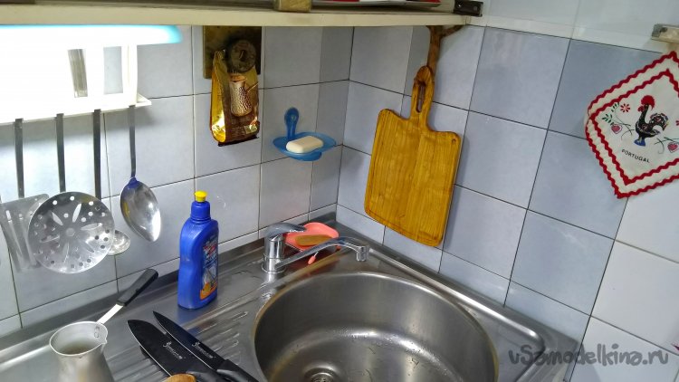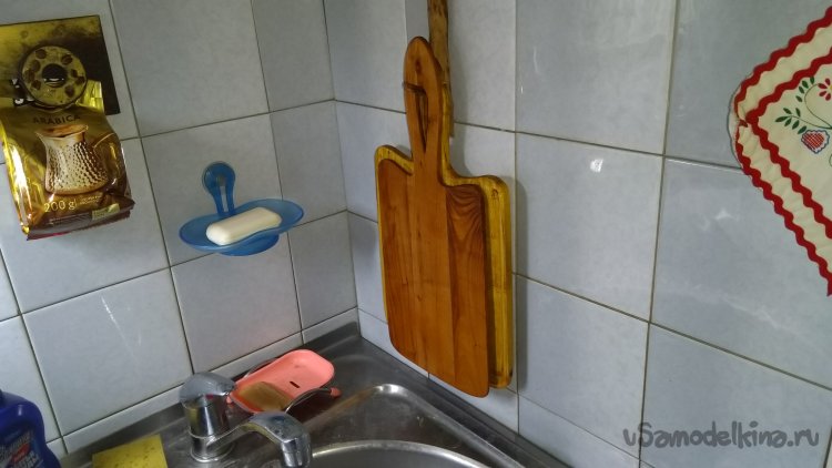 Обычно тут пара досочек висит, всегда под рукой, сохнут быстро, капли с мытых досочек стекают в мойку.