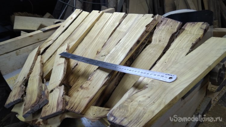 После распиловки на ламели, выбираю с неповреждёнными участками. Для пищевых продуктов ведь, никаких трещин или червоточин быть не должно. Я знаю, что самые лучшие досочки из гевеи, но у нас такое дерево не растёт, не встречал по крайней мере. И в магазине не продаются, а заказывать через интернет и потом ехать получать на почте, терять день. Никакого желания нет. Поэтому делаю из того что есть.