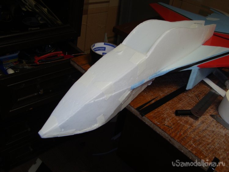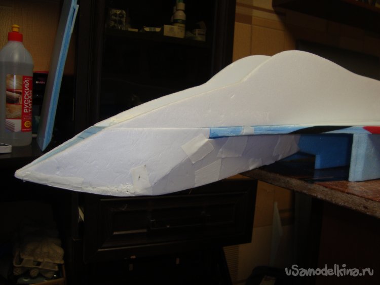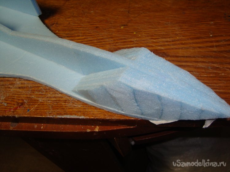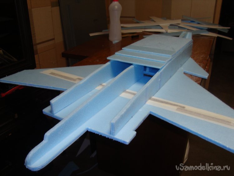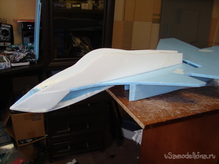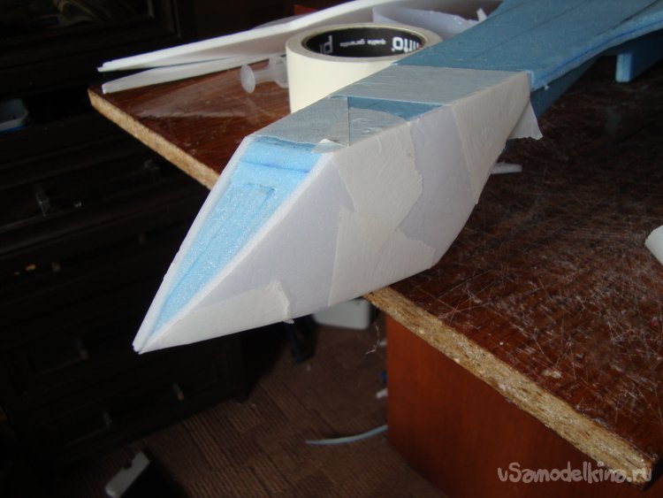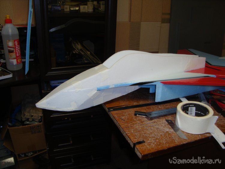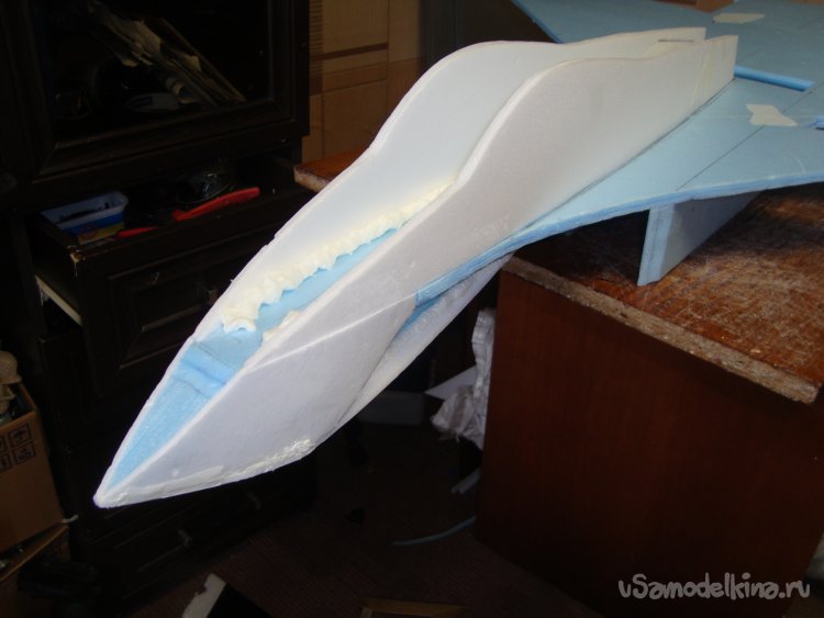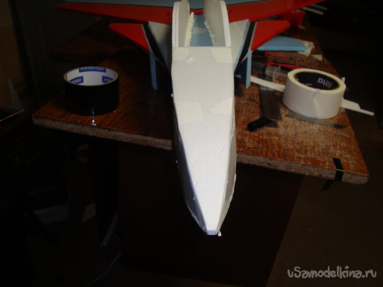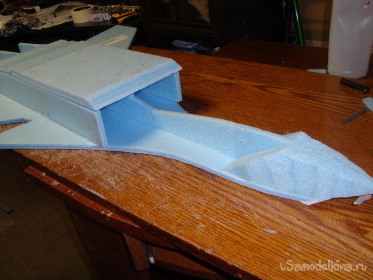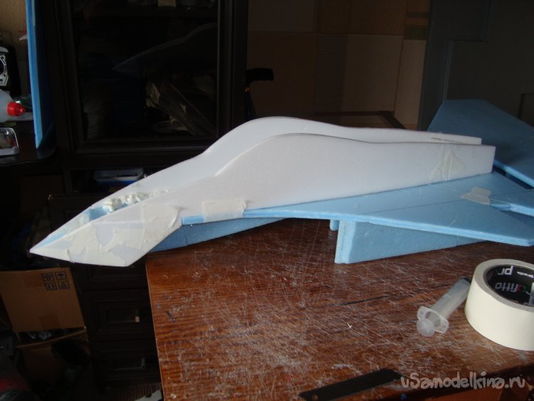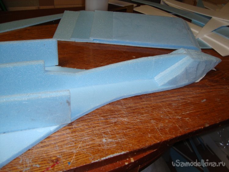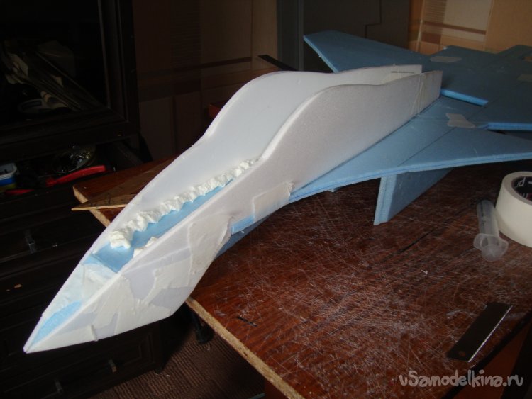 В нижней, носовой части фюзеляжа делается утолщение из нескольких слоёв подложки. Хотел было делать это утолщение из слоёв потолочной плитки,также как и вертикальные перегородки воздухозаборников, но соотношение веса не позволило это сделать. Вырезал всё из подложки.