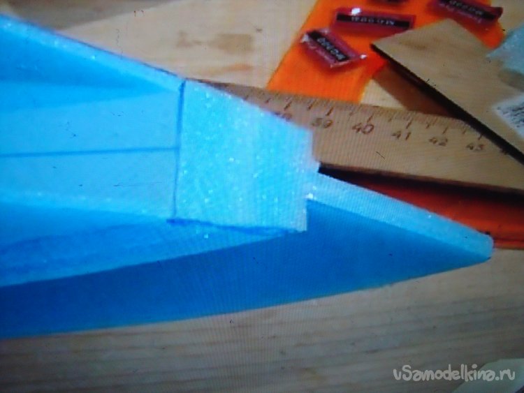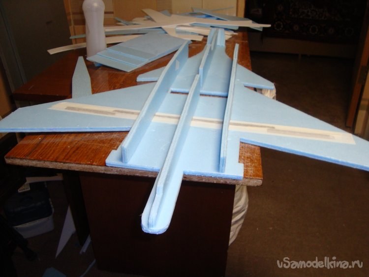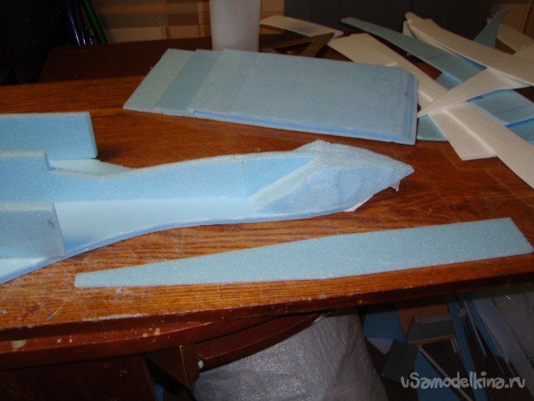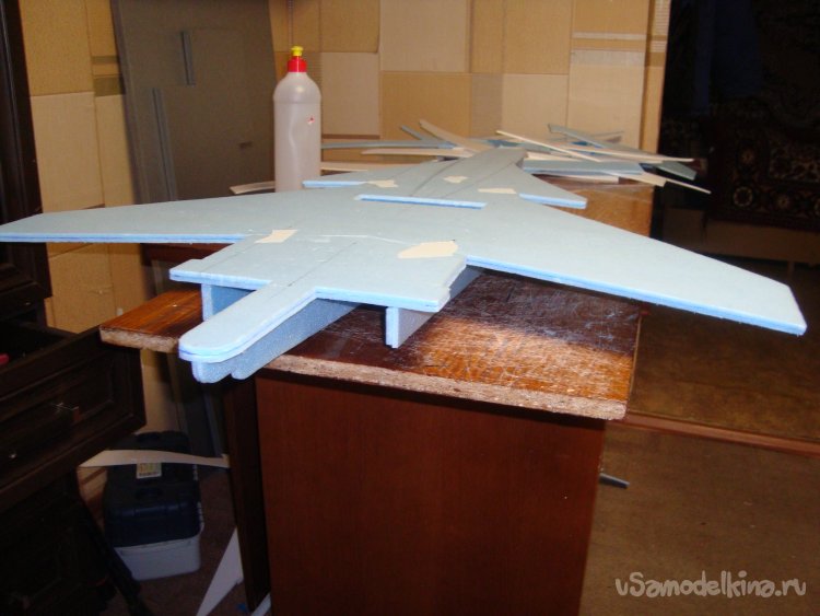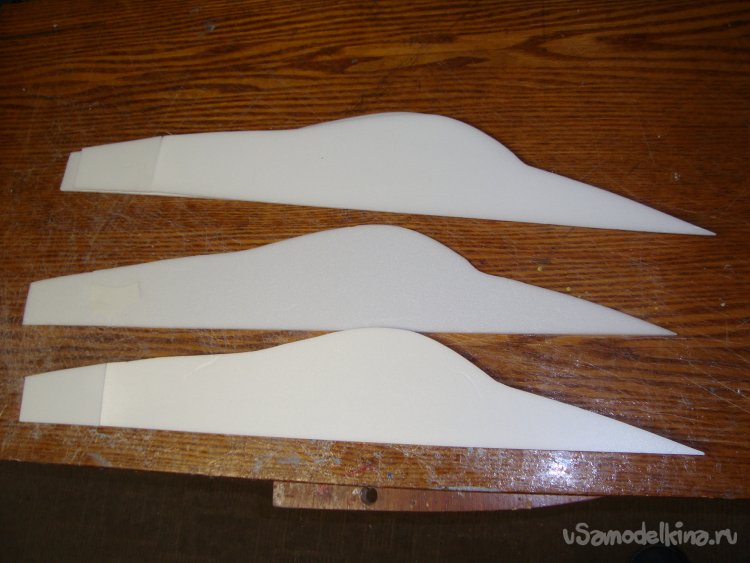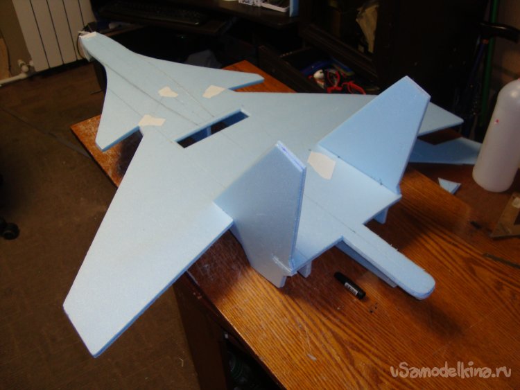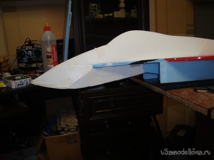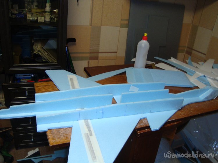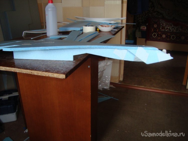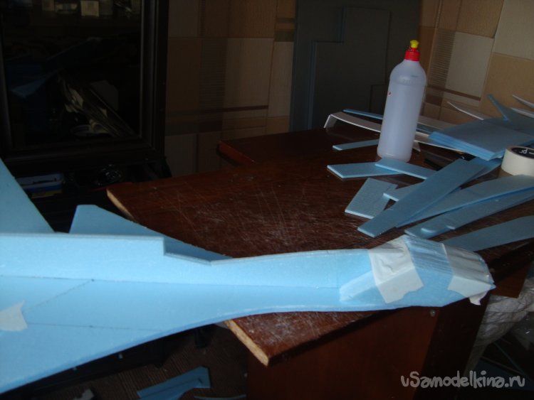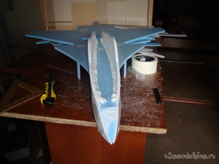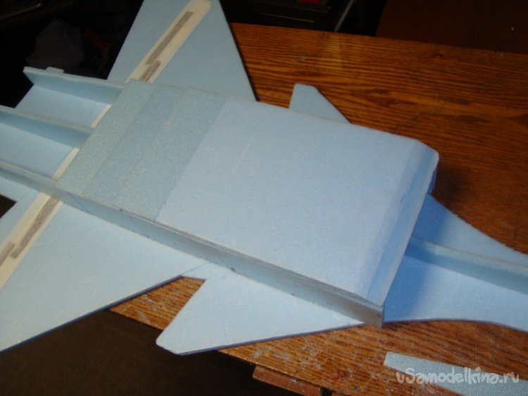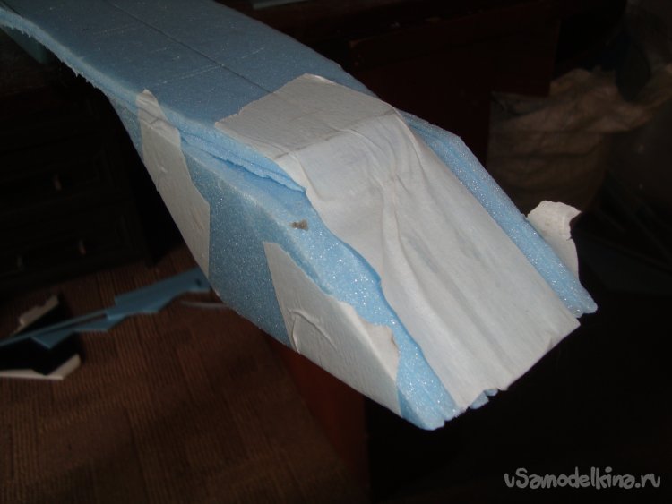 В нижней, носовой части фюзеляжа делается утолщение из нескольких слоёв подложки. Хотел было делать это утолщение из слоёв потолочной плитки,также как и вертикальные перегородки воздухозаборников, но соотношение веса не позволило это сделать. Вырезал всё из подложки.