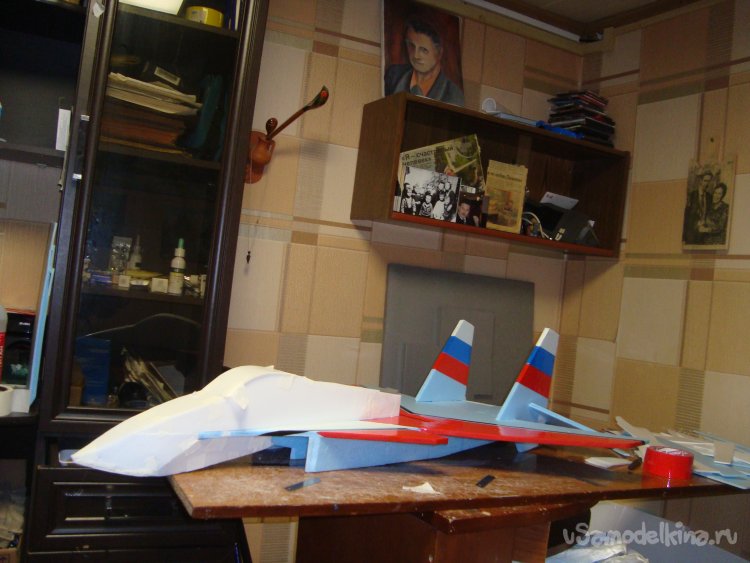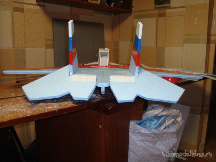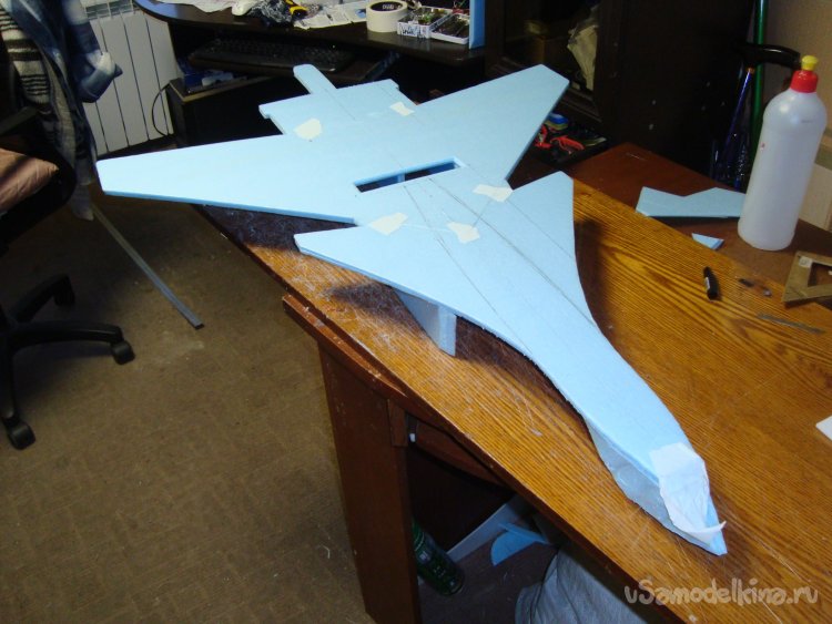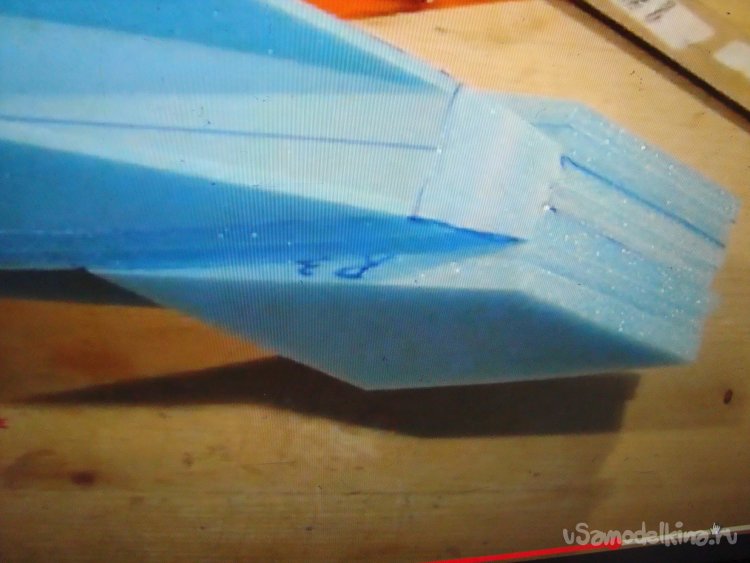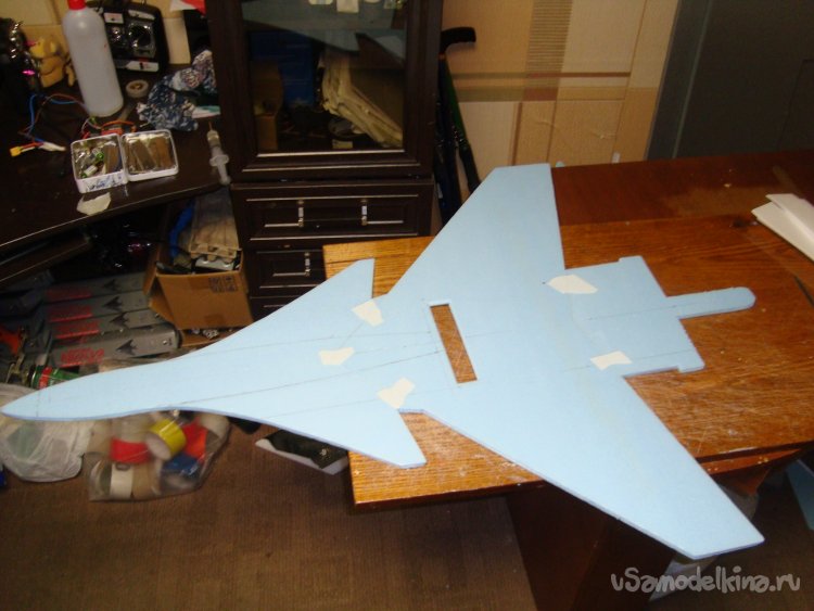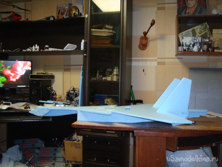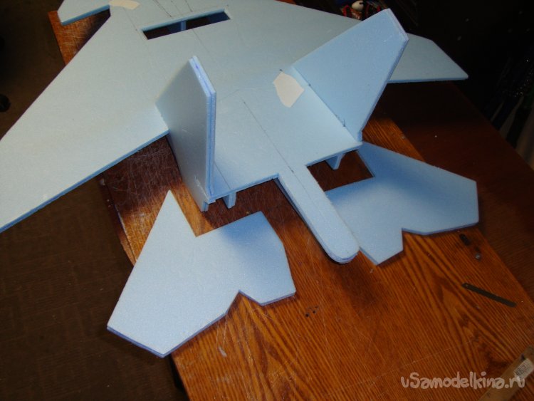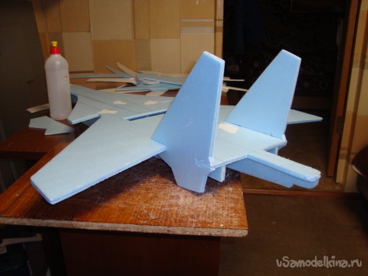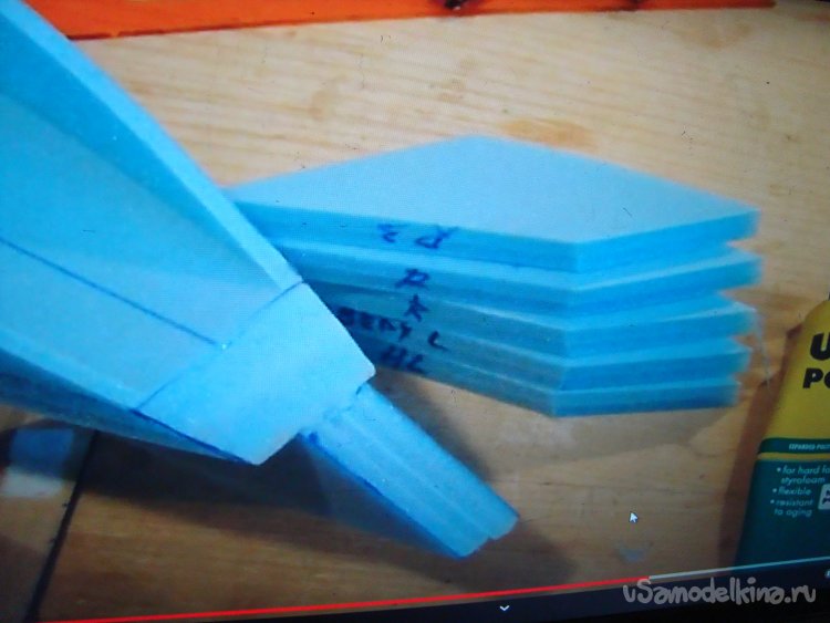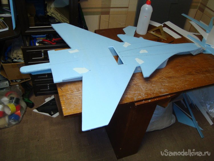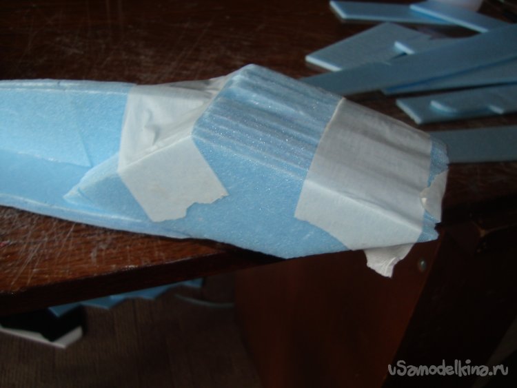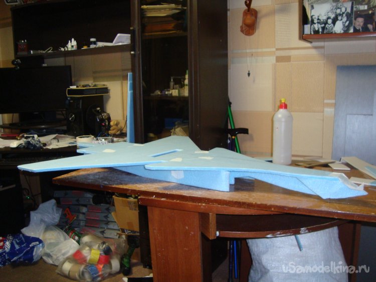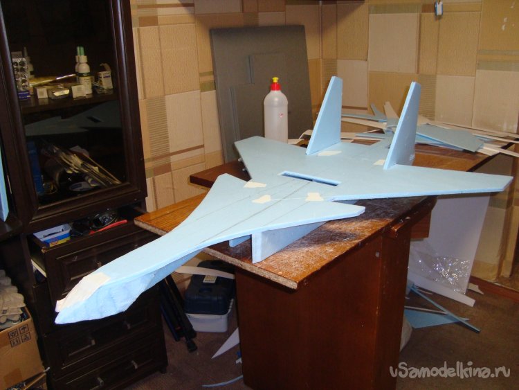 В нижней, носовой части фюзеляжа делается утолщение из нескольких слоёв подложки. Хотел было делать это утолщение из слоёв потолочной плитки,также как и вертикальные перегородки воздухозаборников, но соотношение веса не позволило это сделать. Вырезал всё из подложки.