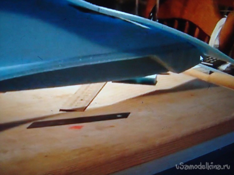 Вклеиваю носовую горизонтальную обшивку в носовой части фюзеляжа.