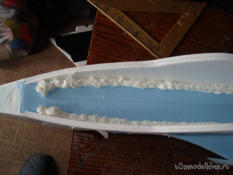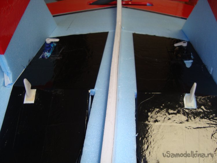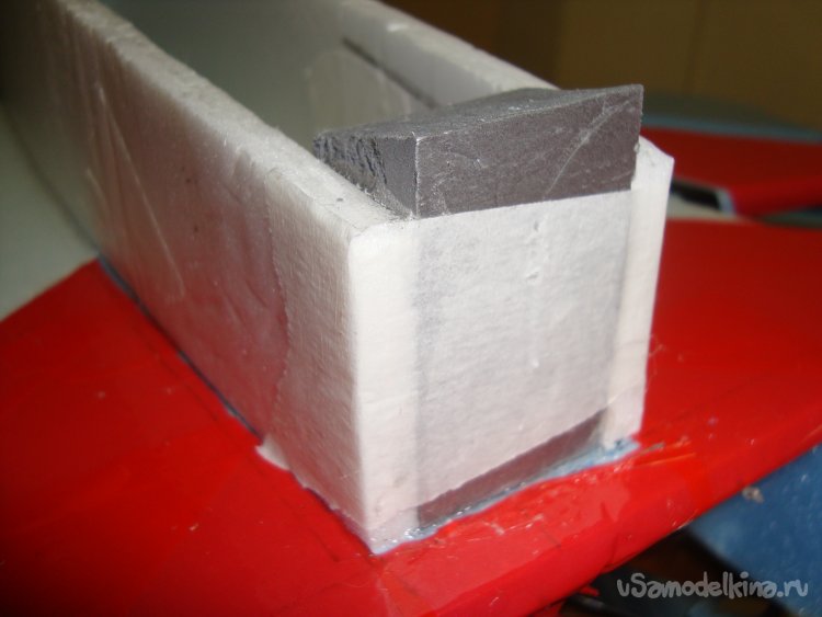 Вклеиваю кусочек утеплителя под место установки мотора.
