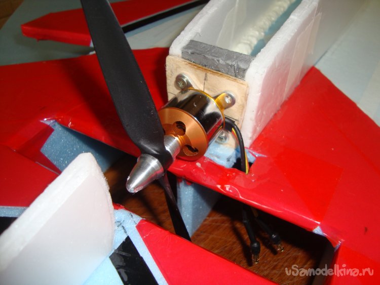 На место установки мотора вклеиваю кусочек фанеры толщиной 3 мм. и устанавливаю мотор.