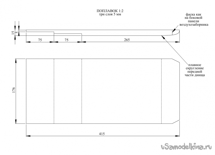 Поплавок склеен из трех слоёв подложки. Примеряю готовый поплавок на стенки воздухозаборников.