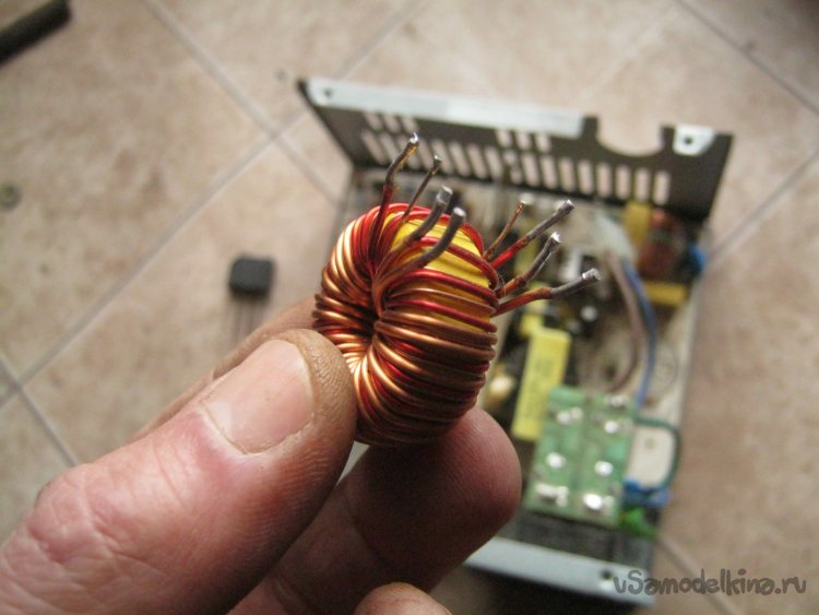 Первым делом изготовил дроссель – из старой распотрошенной платы ИБП ПК добыл заготовку (Фото 3). Многоножку выпаял строительным феном, благо, церемонится с подложкой нужды не было.