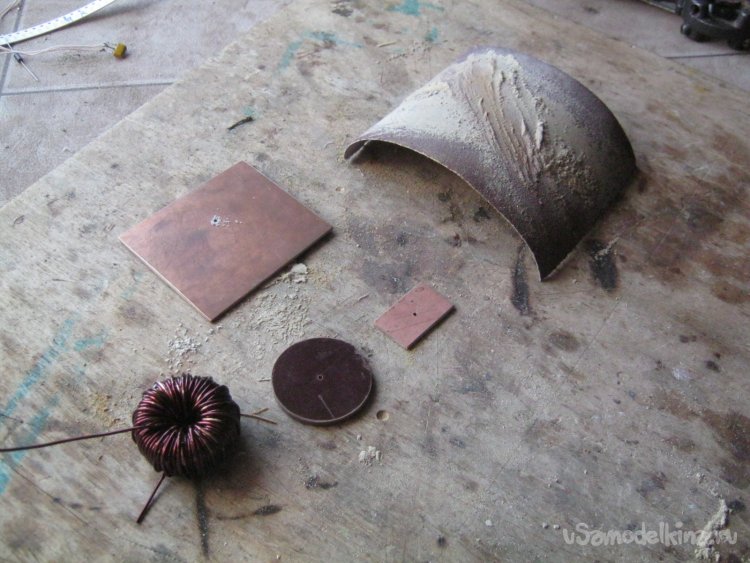 Фото 7. Готовая катушка-дроссель фильтра и заготовки его элементов из слоистых пластиков – основная большая – из двухсторонне фольгированного, маленький прямоугольник для удержания катушки – односторонне фольгирован, шайба изолятор и вовсе из простого нетолстого текстолита. Заготовки подобрал в обрезках, разметил, выпилил лобзиком по дереву, выровнял торцы на наждачной бумаге положенной на ровную поверхность.