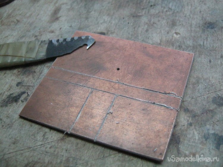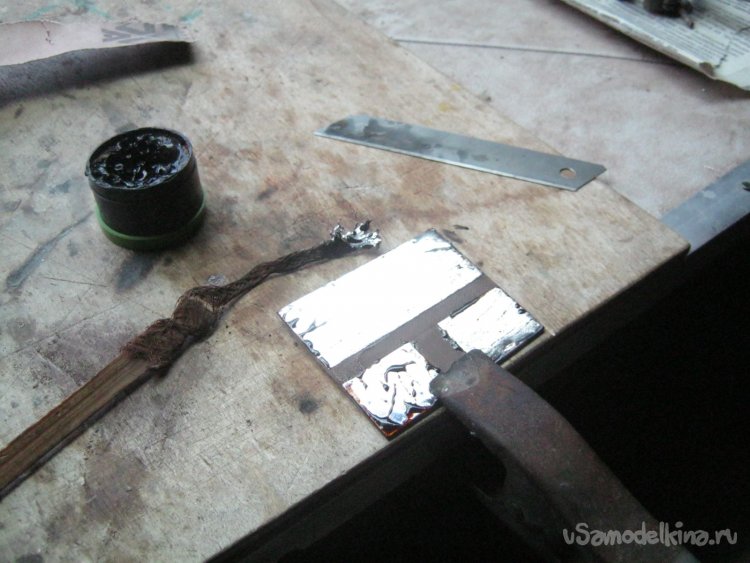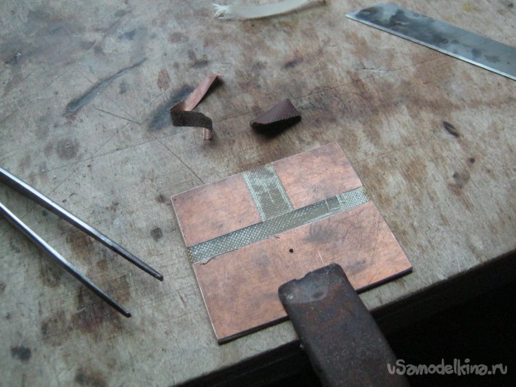 Фото 9. Лишнюю фольгу снял, прижав заготовку к столу и прогрев медь строительным феном. Поддетая за угол острым лезвием полоска без труда снимается пинцетом.