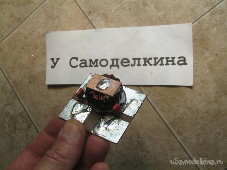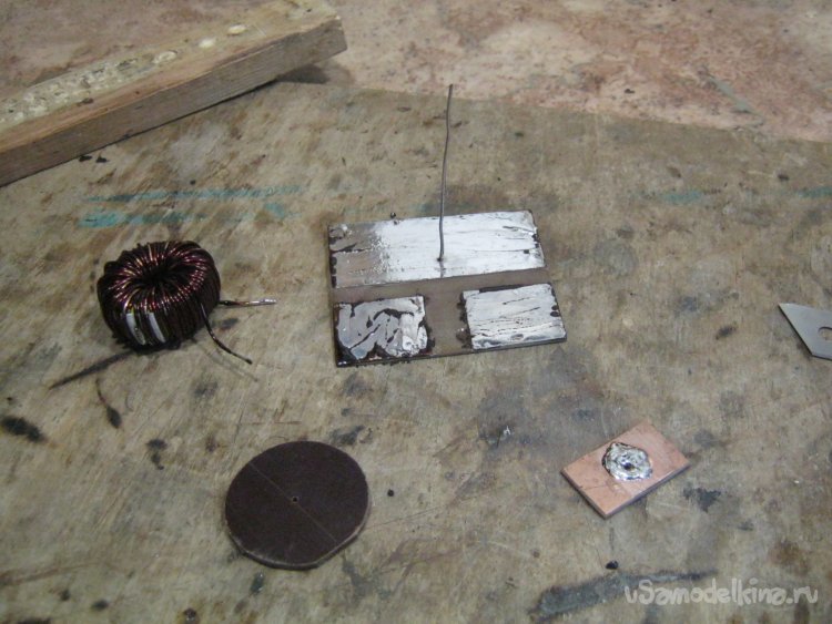 Фото 11. Зачищенную и залуженную нетонкую медную проволочину впаял с обратной стороны платы. Это тяга не дающая катушке упасть. На нее нанизал шайбу из текстолита, плюхнув под низ немного силиконового герметика для электромонтажа. На эту изолированную подложку прилепил на тот же герметик катушку и зафиксировал сборку перекладиной из квадратика фольгированного материала.