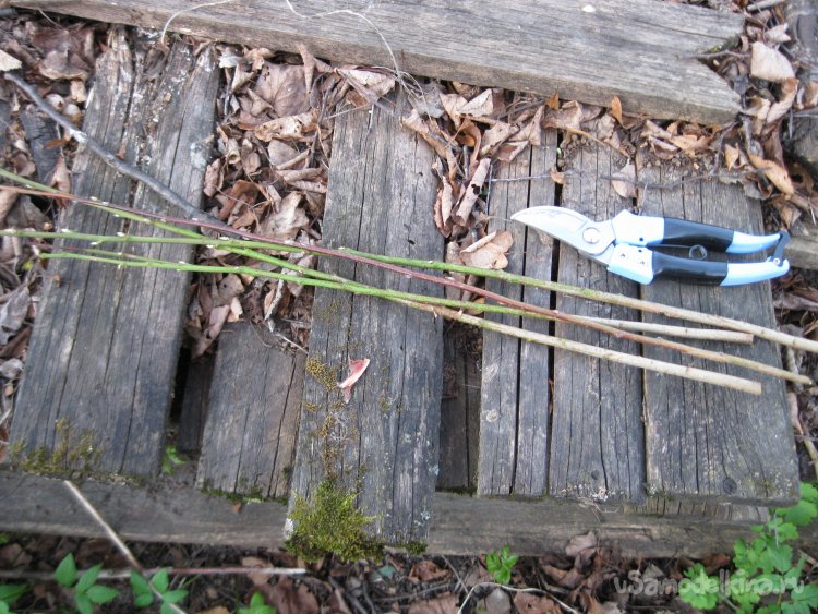 Ну, а в заключение хочу отметить, что если у кого-то из садоводов не растут в саду вишни и сливы, дающие поросль, то подобные подпорки вполне можно сделать из прямых тонких веточек некоторых деревьев, например, ветлы, ивы, вяза, орешника и т.п. Более того, такие веточки можно будет еще и ошкурить, поскольку весной у них очень хорошо отходит кора. В этом случае, подпорки уже не будут прорастать.