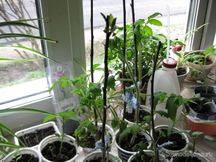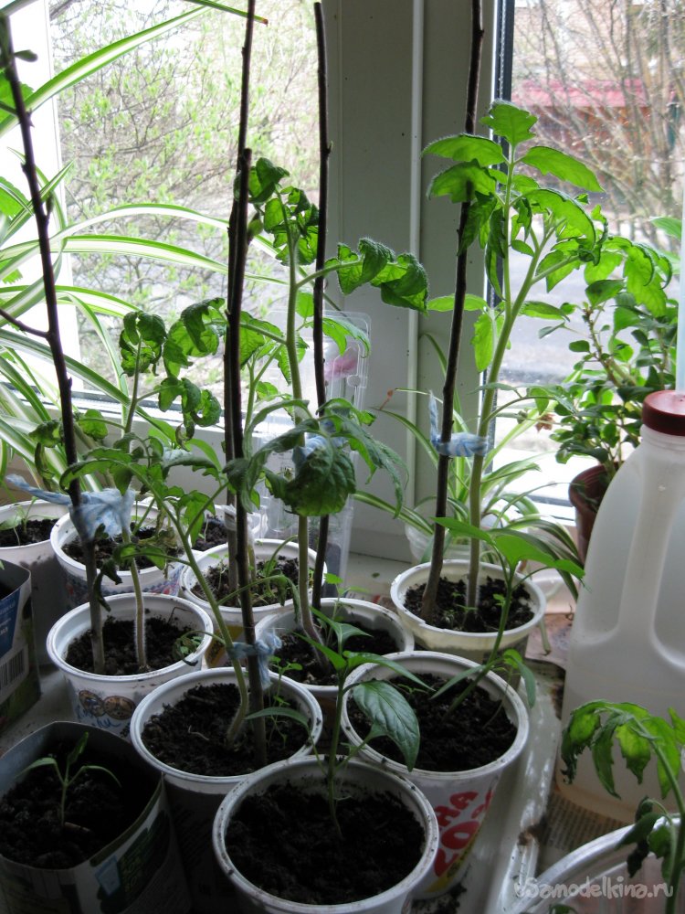 Ну, а теперь, собственно, осталось воткнуть подпорки в контейнеры с рассадой и подвязать к ним молодые растения.
