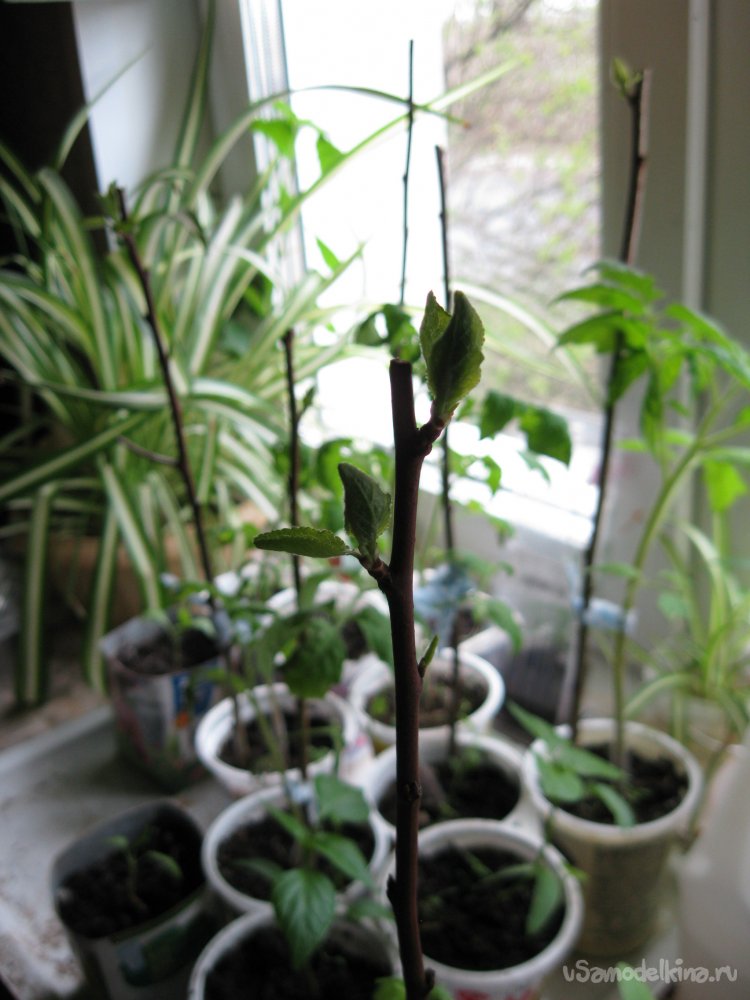 Данный совет заключается в том, что процесс борьбы с порослью от некоторых плодовых деревьев, можно превратить из нудного занятия в полезное дело. И все это благодаря тому, что срезанную поросль, вполне можно использовать в качестве достаточно удобных подпорок для садовой рассады, растущей на подоконнике. Я лично делаю так уже много лет (уже, наверное, лет двадцать или даже больше).