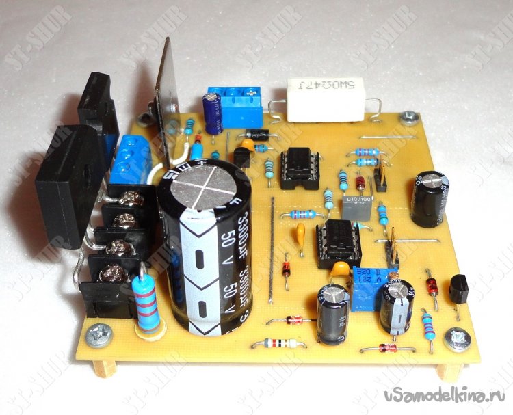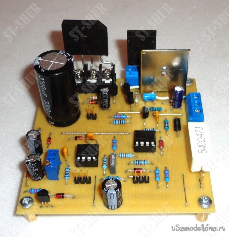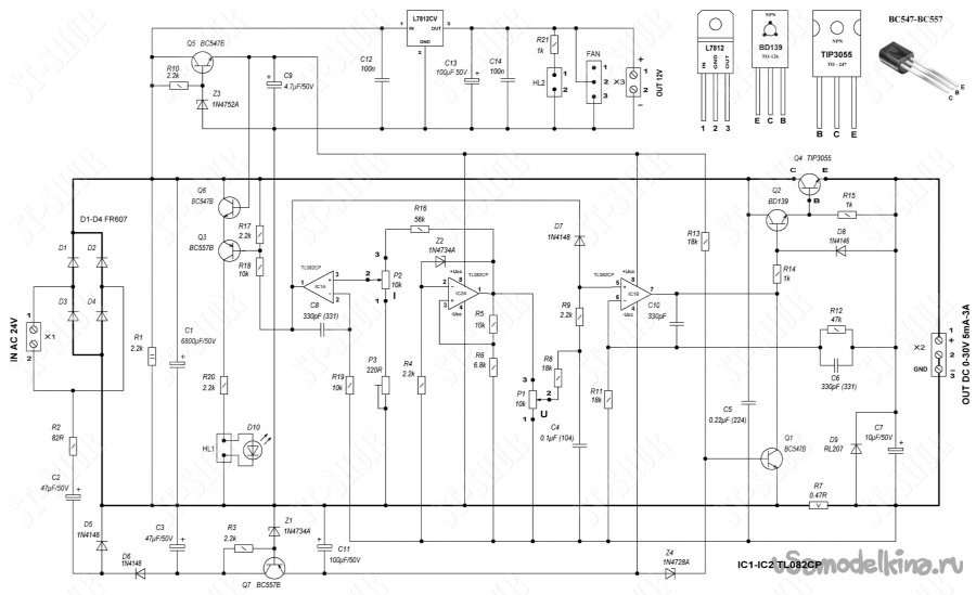 Вместо указанного в оригинале схемы транзистора Q4 2N3055 в металлическом корпусе TO-3 использован аналог TIP3055 в пластиковом корпусе TO-247 (т.к. удобнее крепить к радиатору, да и стоит дешевле). Так же применены более сильноточные диоды выпрямителя, что уменьшает их нагрев.