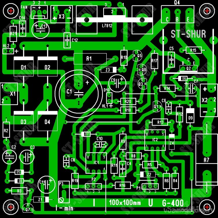 Вариант №1 собран на стеклотекстолите размером 100х100мм, где к оригинальной схеме добавлен простейший стабилизатор на 12В (для питания вентилятора, ампер-вольтметра и прочих возможных «дополнений»). Так же установлены более мощные выпрямительные диоды (на 6А) и конденсатор С1 большей емкости (6800мкф на 50В). Данный вариант платы предусматривает подключение выходного транзистора Q4 с помощью проводов.