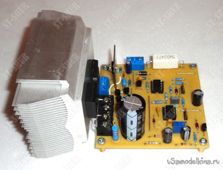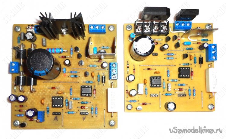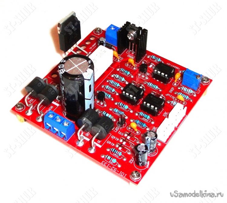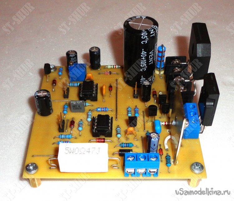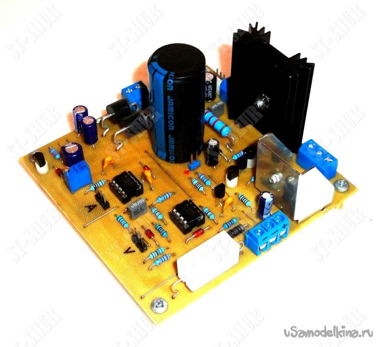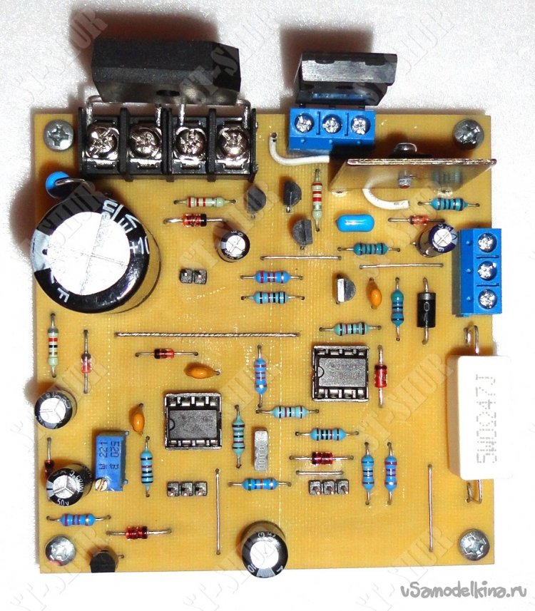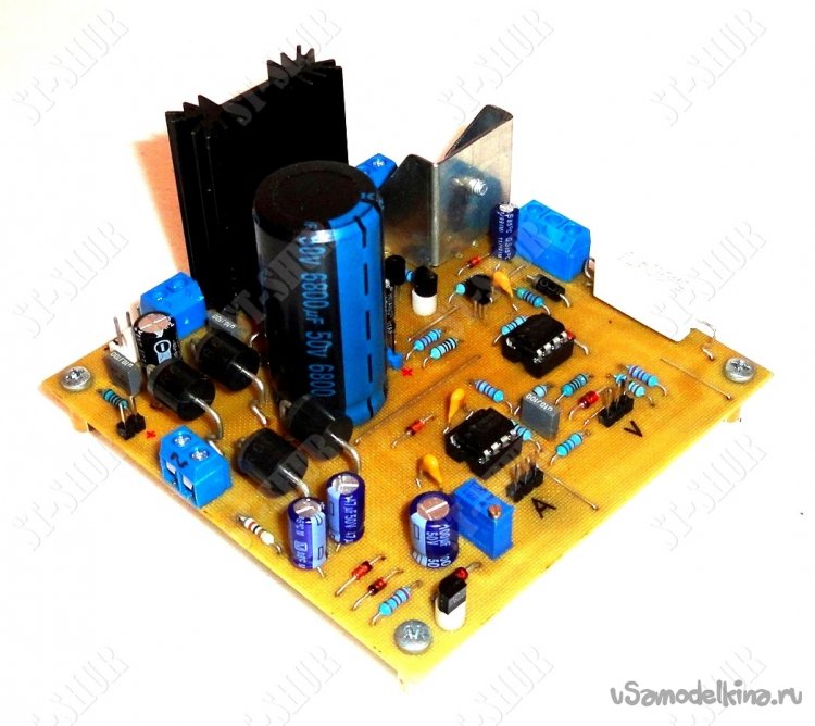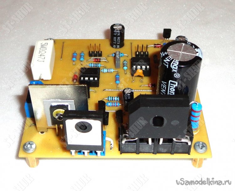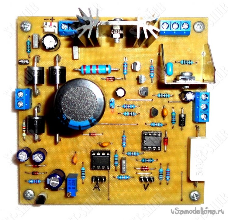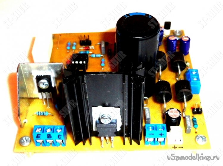 Выпрямительные диоды заменены мостом KBU810 (на 8А), который может располагаться в одной плоскости с выходным транзистором. Это достаточно удобно при их монтаже на общий радиатор. В данном варианте п/п стабилизатор на 12В на плате не предусмотрен. Хотя устанавливается без проблем, на общий радиатор (в случае необходимости) благодаря использованию клеммной колодки «KEFENG KF-7.62» открытого типа.