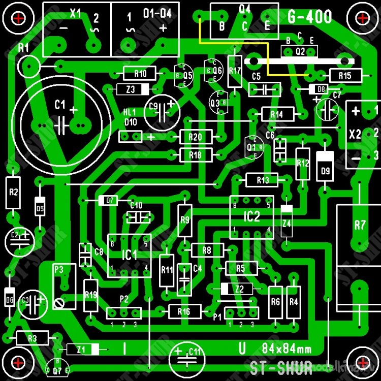Вариант №2 собран на стеклотекстолите размером 84х84мм. Размер платы, расположение крепежных отверстий, положение контактов выходного транзистора Q4, соответствует расположению этих элементов на плате ранее собранного китайского конструктора, что облегчает замену одной платы на другую, без изменения конструкций крепежа в корпусе ЛБП.